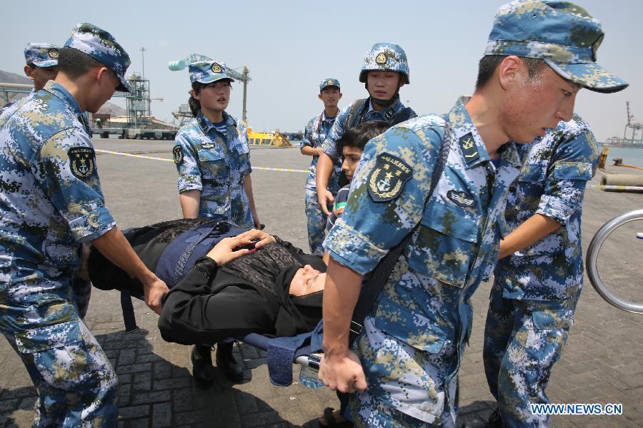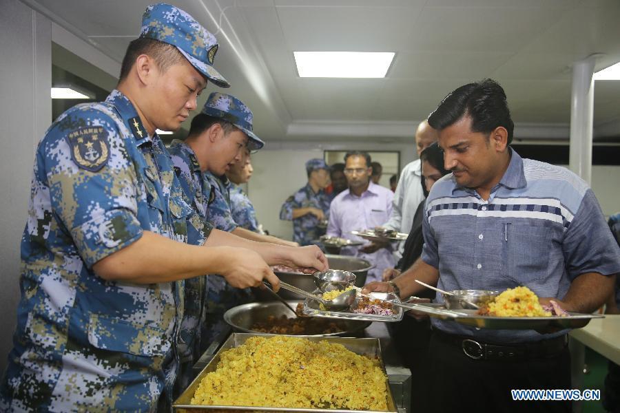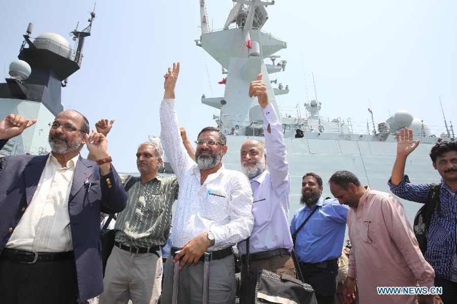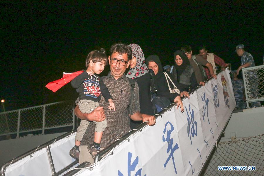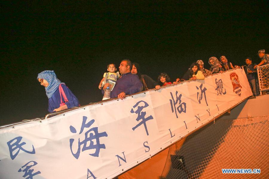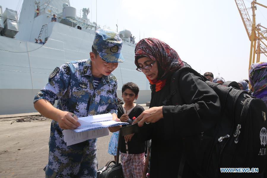 People prepare to board the Chinese Linyi missile frigate in Aden Harbor, Yemen, April 2, 2015. A total of 225 nationals from 10 countries who were evacuated from conflict-ridden Yemen arrived in Djibouti onboard a Chinese frigate on Thursday. (Photo: Xinhua/Pan Siwei)
