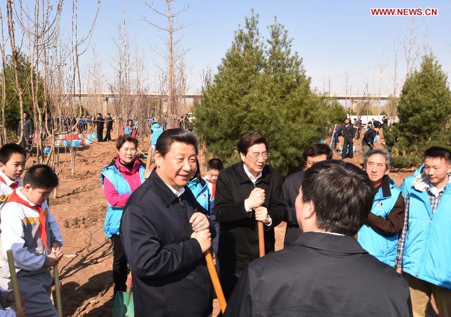 Chinese President Xi Jinping (1st L, front) talks with other participants during a tree-planting event in Sunhe Township of Chaoyang District in Beijing, capital of China, April 3, 2015. Top Communist Party of China (CPC) and state leaders Xi Jinping, Li Keqiang, Zhang Dejiang, Yu Zhengsheng, Liu Yunshan, Wang Qishan and Zhang Gaoli attended a tree planting event in Beijing on Friday. (Photo: Xinhua/Zhang Duo)