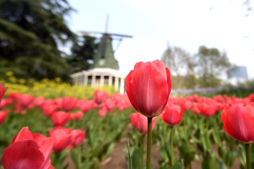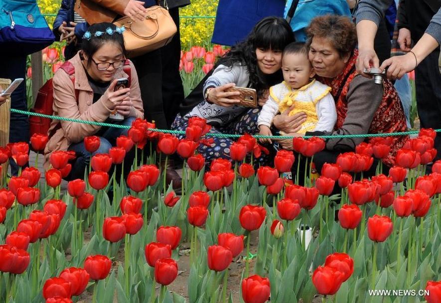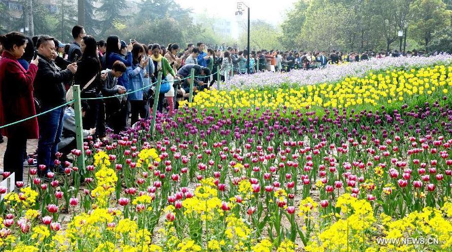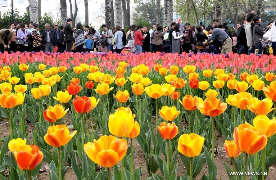 Blooming tulips are seen at Renmin Park in Zhengzhou, capital of central China's Henan Province, April 4, 2015. (Photo: Xinhua/Li Bo)