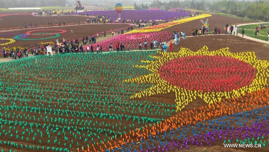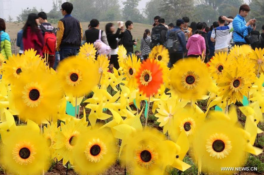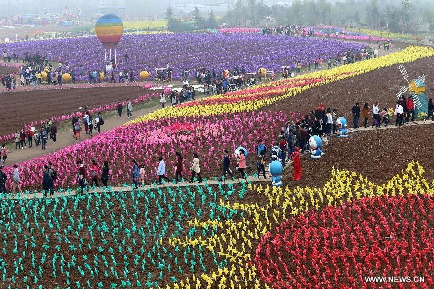 Colorful pinwheels are seen at a park in Luoyang City, central China's Henan Province, April 4, 2015. Different patterns formed by about 300,000 pinwheels attracted a lot of tourists to the park on the first day of three-day holiday of Qingming Festival, or Tomb-sweeping Day. (Photo: Zhang Xiaoli/Xinhua)