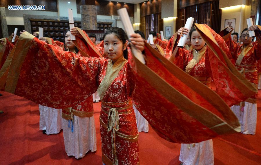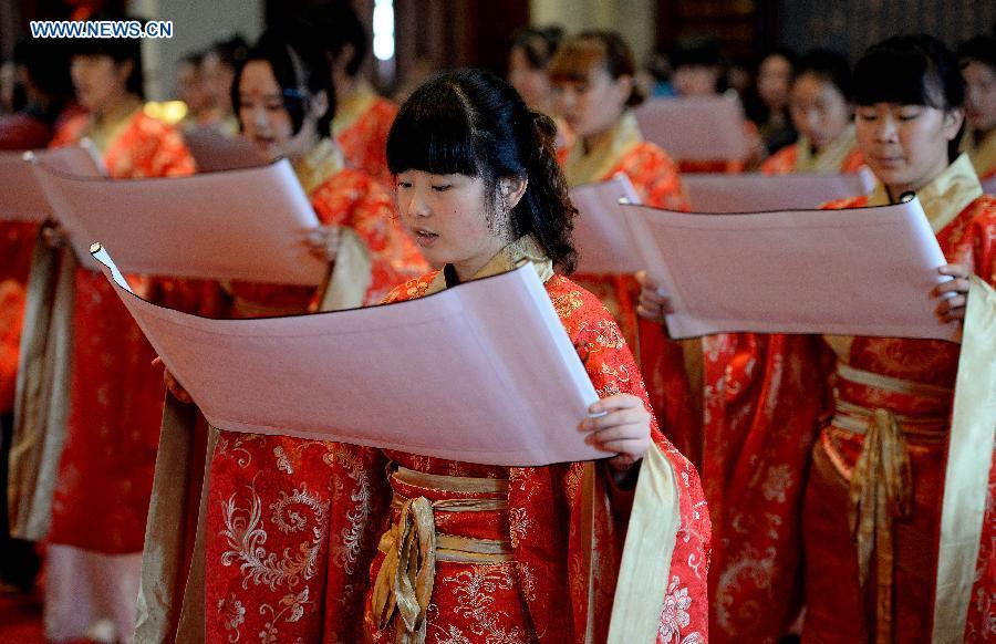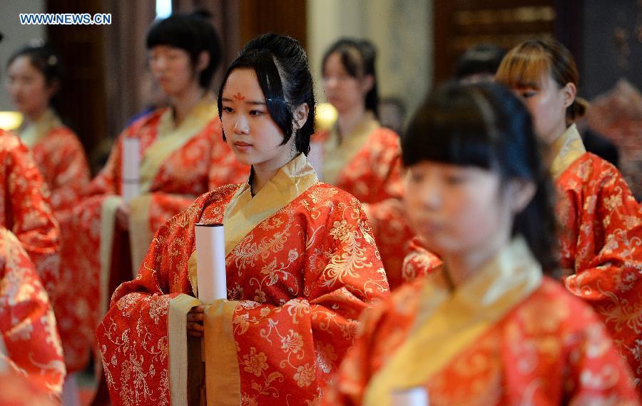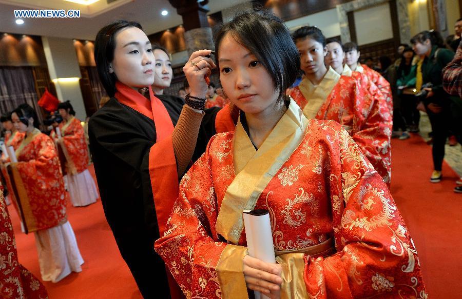 Girls are dressed up during a female adulthood ceremony in Hancheng Lake in Xi'an City, capital of northwest China's Shaanxi province, April 6, 2015. More than 30 girls observed the tradition of the Han people to enter their adulthood during the ceremony. (Photo: Xinhua/Liu Xiao)