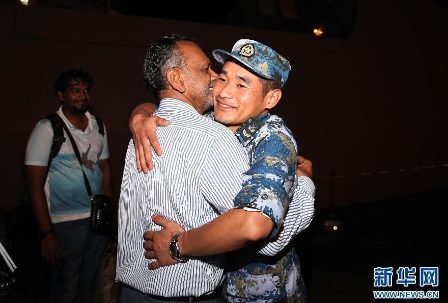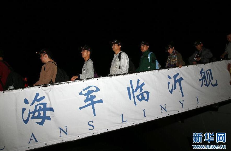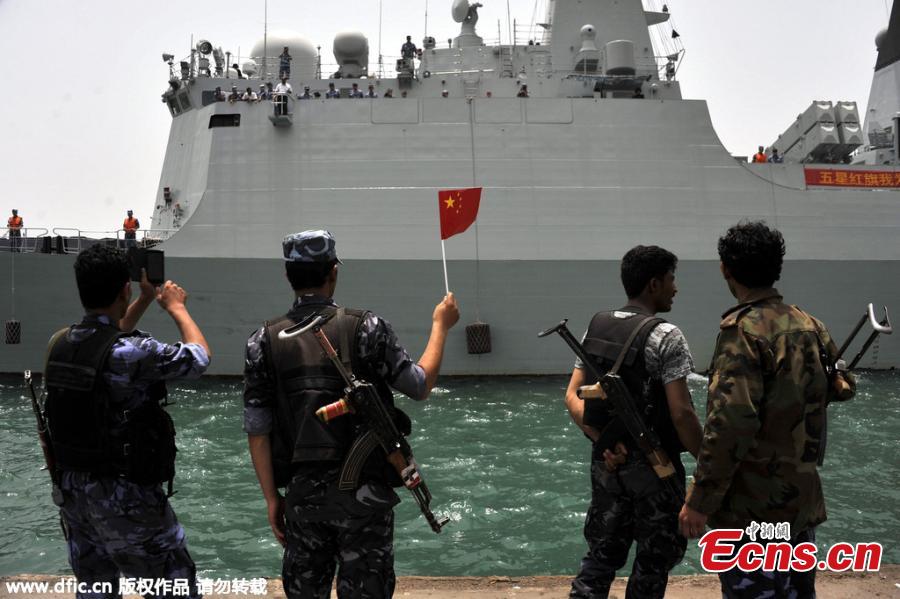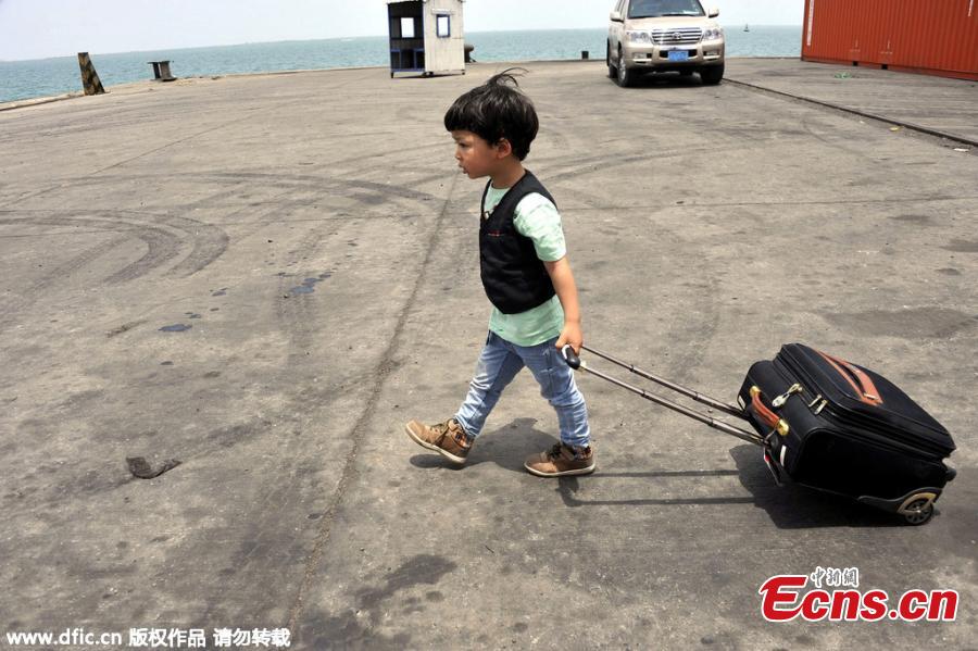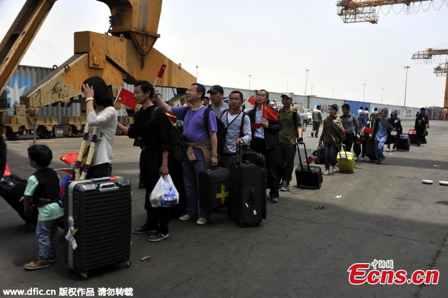 Chinese citizens queue up before boarding a naval vessel to evacuate from Yemen, April 6, 2015. China has moved the last batch of 24 Chinese nationals from Yemen's western port of al-Hodayda to Djibouti on Monday, according to the Chinese Foreign Ministry. The Linyi naval vessel also carried 45 Sri Lanka nationals at the request of Sri Lanka government. (Photo/IC)