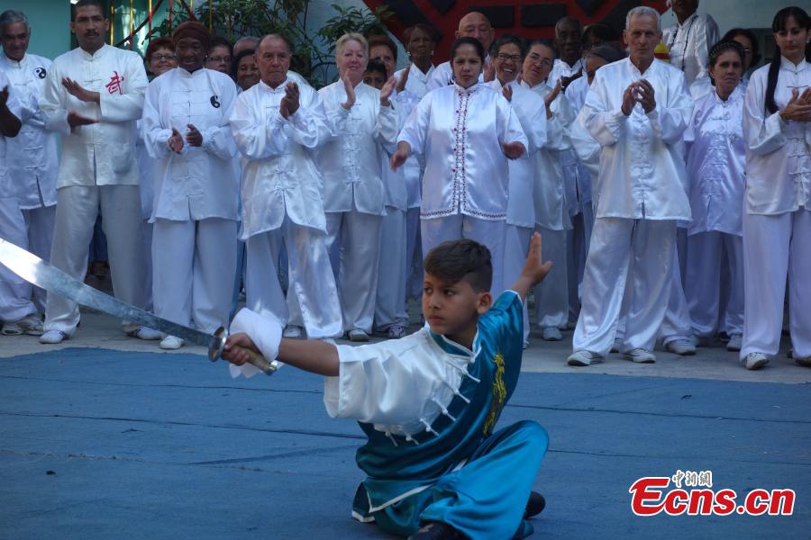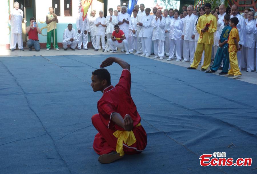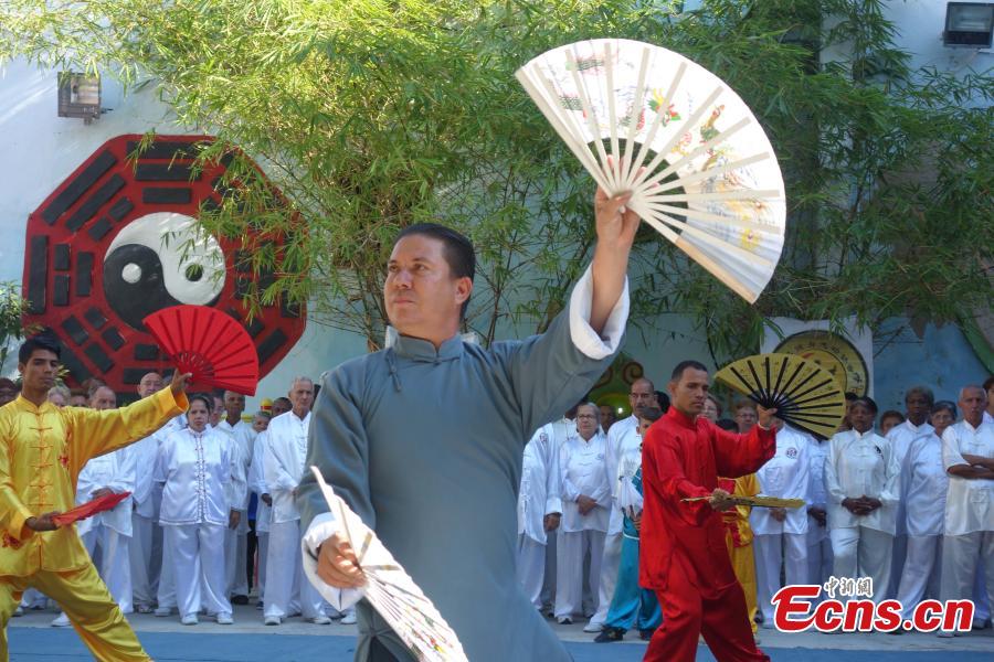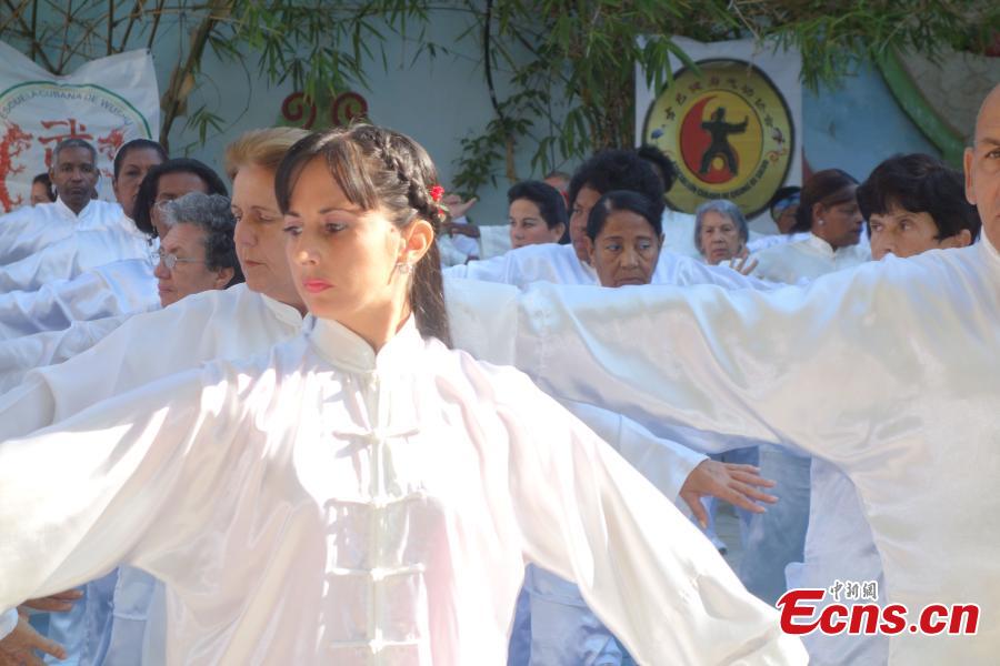 Cubans perform tai chi during the opening ceremony of a training session at a martial arts school in Havana. (Photo: China News Service/Mo Chengxiong)