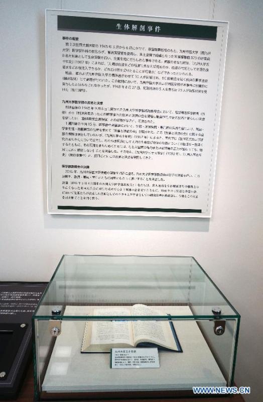 Photo taken on April 7, 2015 shows one of exhibits disclosing the live dissection of captured American pilots in World War II at the medical history museum of Kyushu University in Fukuoka, Japan. The Kyushu University's medical history museum was open to the public on campus recently, in which some items displayed that eight American pilots were dissected alive at Kyushu University after they were captured in 1945. (Photo: Xinhua/Liu Xiuling)