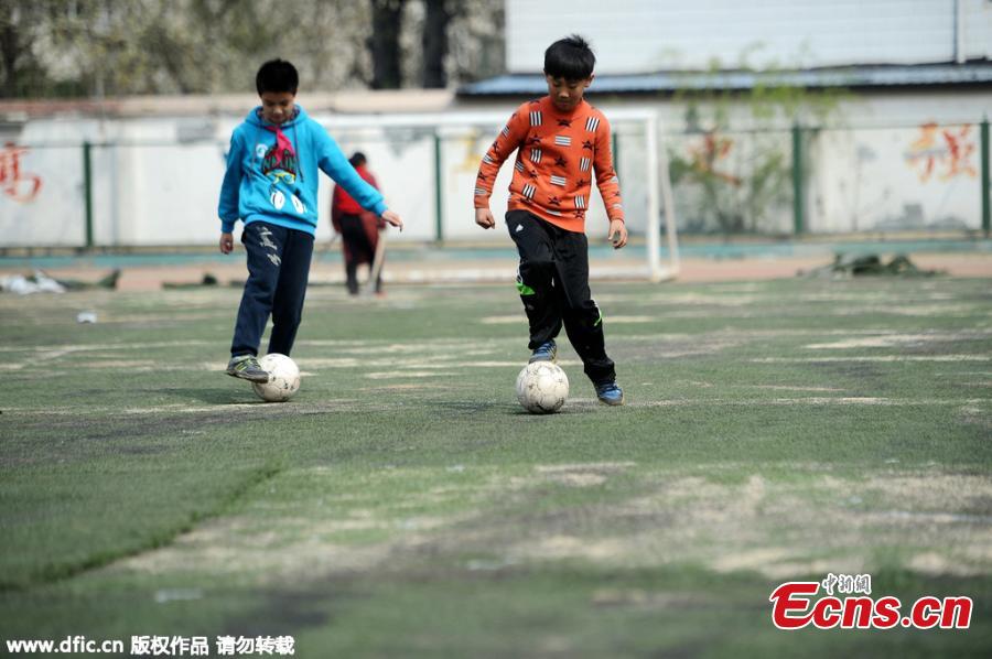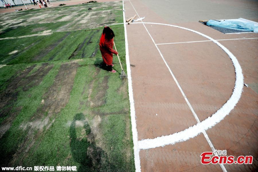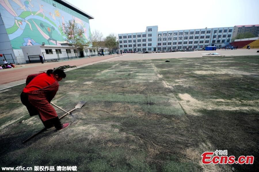 A worker installs artificial turf field at an elementary school in Jinan, East China's Shandong province, April 7, 2015. China has introduced an overall reform plan to boost professional and amateur soccer in the country. More efforts would be made at the grassroots level to nurture young talents, according to the decision. (Photo/IC)