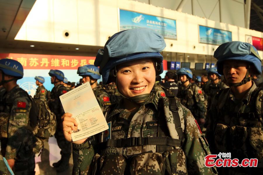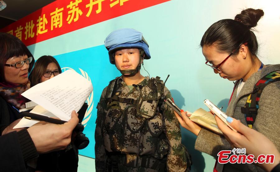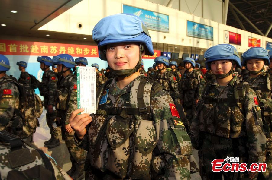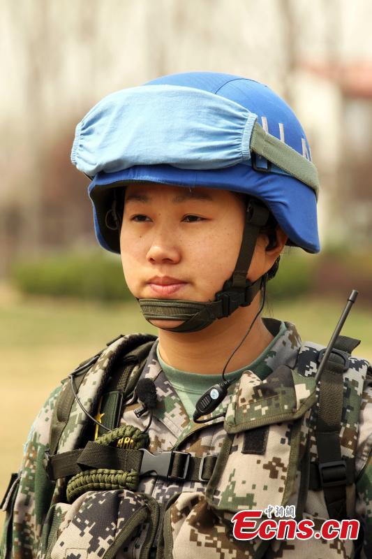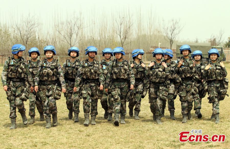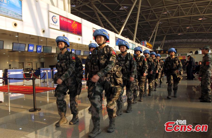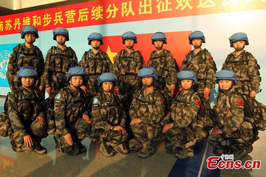 Female soldiers are among 130 peacekeeping troops set for departure at an airport in Jinan, East China’s Shandong province, April 7, 2015. The 130 troops are the last detachment of the country's first deployment of a full infantry battalion for a United Nations (UN) peacekeeping mission to South Sudan. The infantry squad composes of 13 female soldiers who were selected from nine provinces and underwent 268 days of intensive trainings. The soldiers will participate in humanitarian relief, patrol streets and perform security duties. (Photo: China News Service/Qiu Chengliang)
