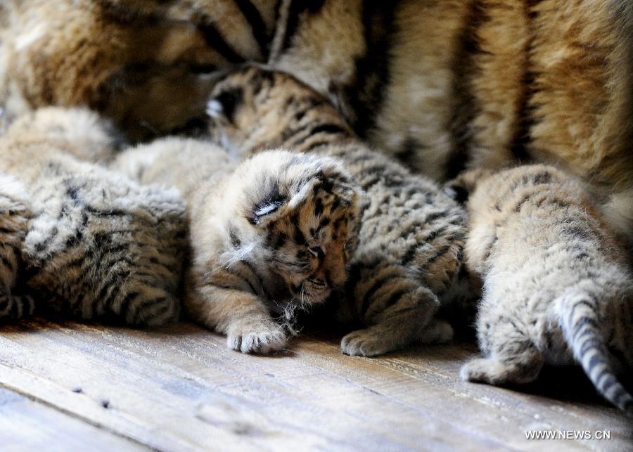 A Siberian tiger and her new-born cubs are seen at Guaipo Siberian Tiger Park in Shenyang, capital of northeast China's Liaoning province, April 8, 2015. A six-year-old Siberian tiger, one of the world's most endangered animals, gave birth to five cubs at the park on April 1. (Photo: Xinhua/Zhang Wenkui)
