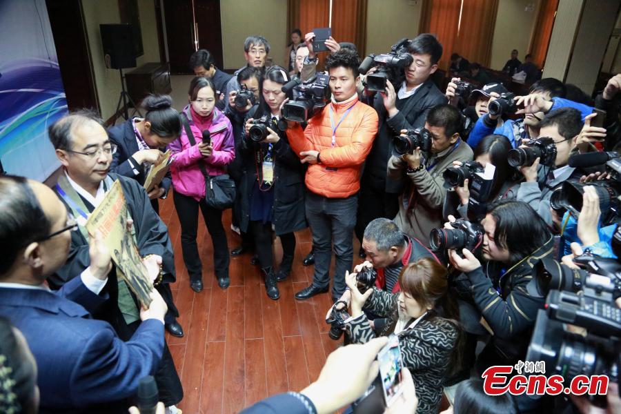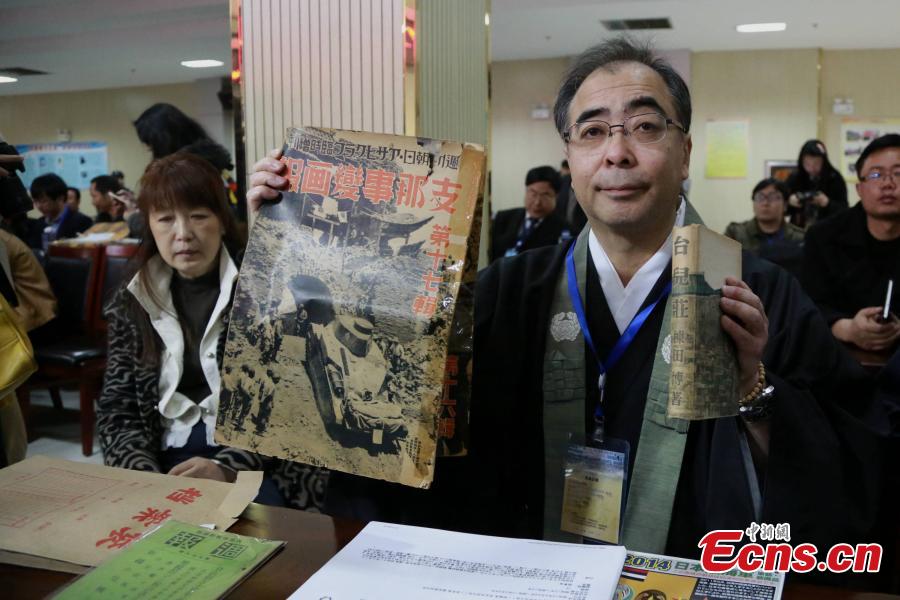 Japanese monk surnamed Ohigashi (R) donates historical documents of Japanese troops invading China during World War II to a memorial in Taierzhuang district, Zaozhuang city, East China’s Shandong province, April 8, 2015. The items Ohigashi donated include magazines and photos. Ohigashi also donated documents and relics to the Memorial Hall of the Victims in Nanjing Massacre by Japanese Invaders in the past. The Battle of Taierzhuang in 1938 marked the first major Chinese victory of the War of Resistance against Japanese Aggression. A ceremony was held to mark the 77th anniversary of the battle. (Photo: China News Service/Liang Ben)