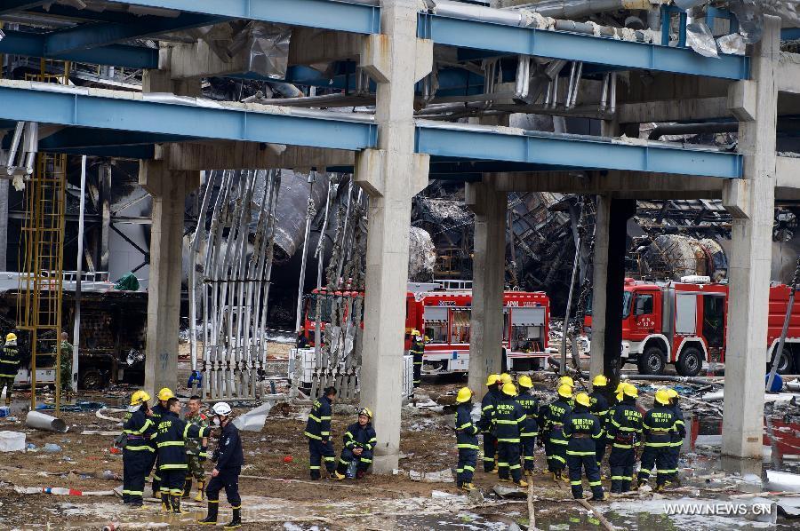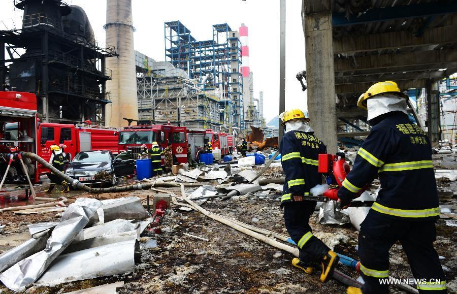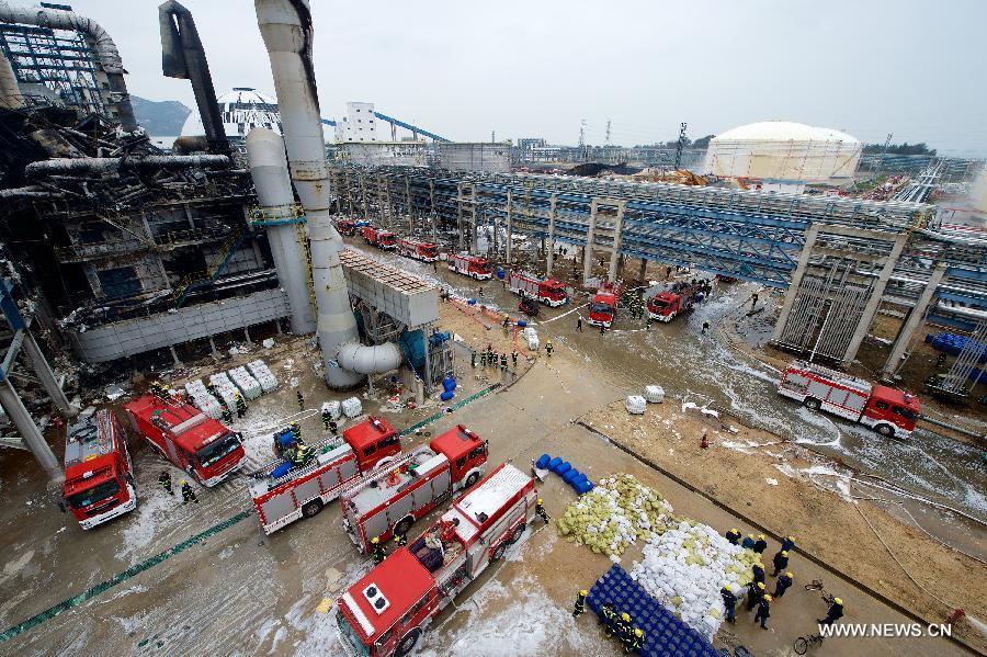 A firefighter examines the site of a fire in a plant of Tenglong Aromatic Hydrocarbon (Zhangzhou) Co. Ltd. on Gulei Peninsula of Zhangzhou City, southeast China's Fujian province, April 9, 2015. The fire in the chemical plant was extinguished at around 2:57 a.m. on Thursday (1857GMT on Wednesday) after storage tanks repeatedly caught fire. On Monday evening, oil leaked from a xylene facility in the plant caught fire and led to blasts at three nearby tanks. (Photo: Xinhua/Jiang Kehong)