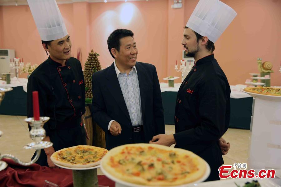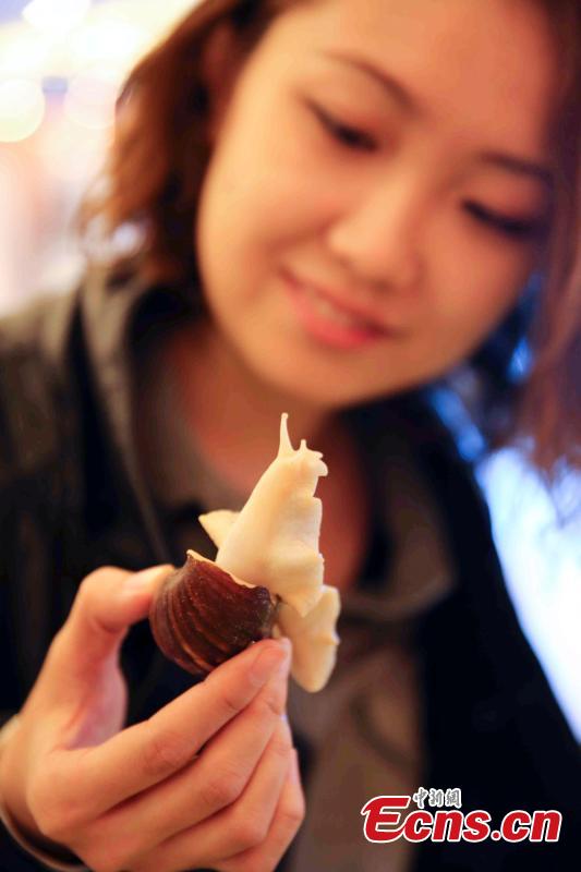 A food festival with a French cuisine theme featuring snails is held at an art zone in Beijing’s Chaoyang district, April 10, 2015. Cooks from China and Italy presented a great variety of dishes made using snails and invited visitors to have a taste, with accompanying wines, during the month-long festival. (Photo: China News Service/Ren Haixia)