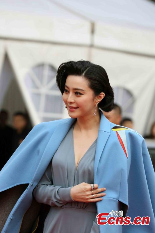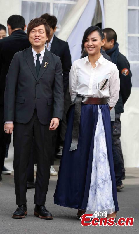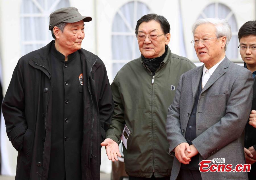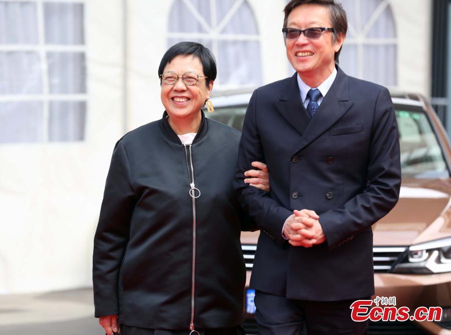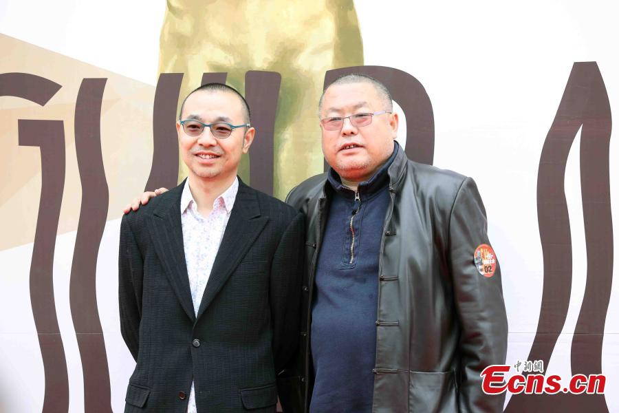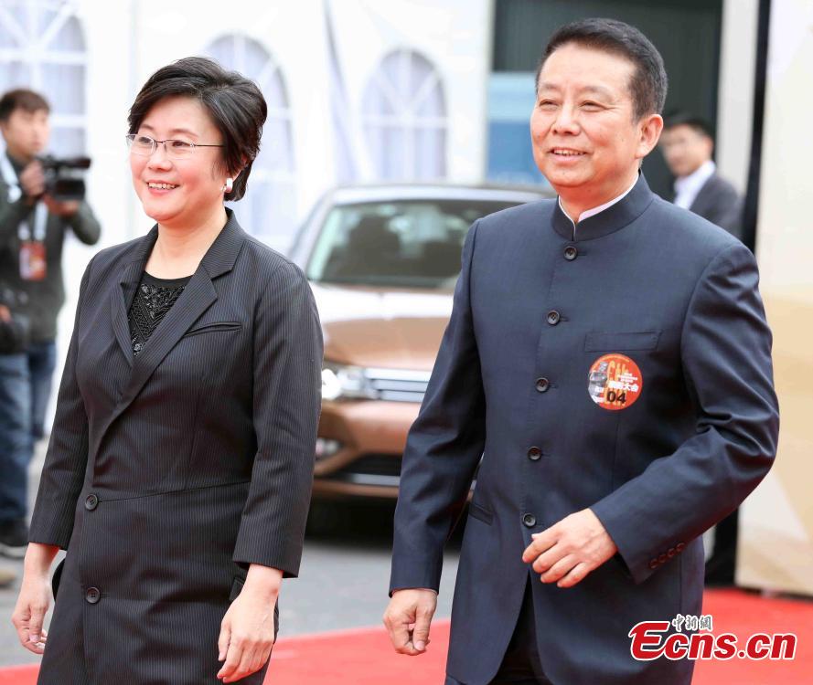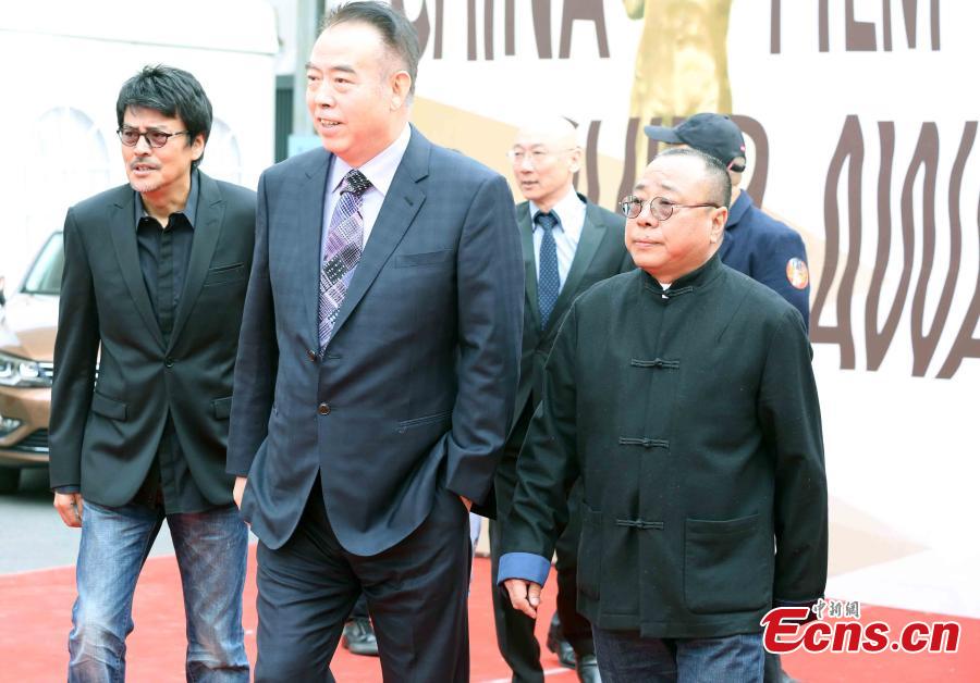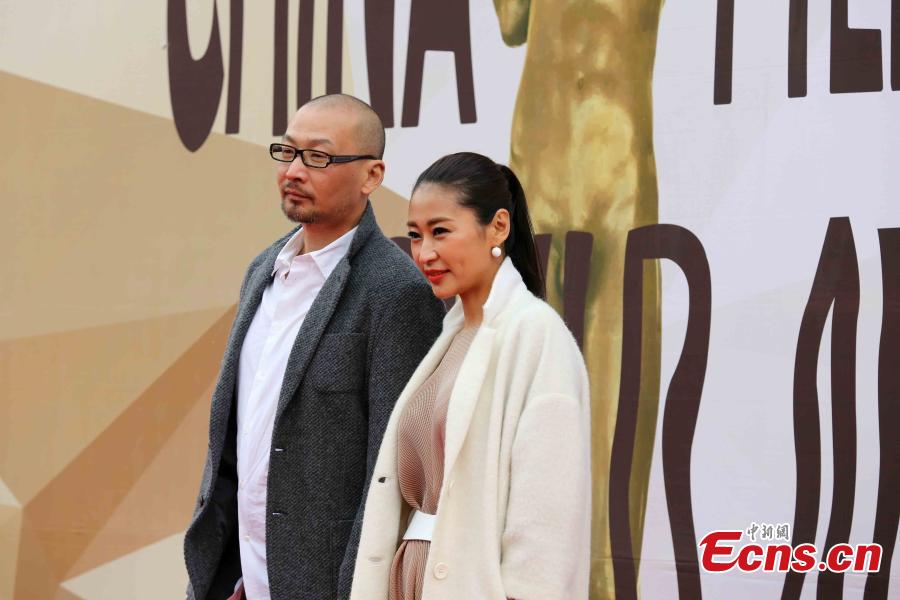 Director Feng Xiaogang (R), actress Tang Wei, and actor Liao Fan attend the annual commendation conference of China Film Directors Guild in Beijing, April 12, 2015. (Photo: China News Service/Ren Haixia)