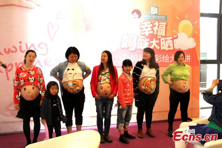A pregnant woman has her belly painted during a contest at an obstetrics and gynecology hospital in Chengdu, Southwest China’s Sichuan province, April 13, 2015. Some 20 fathers-to-be drew paintings on their wives in the activity. (Photo: China News Service/Liu Yanjun)