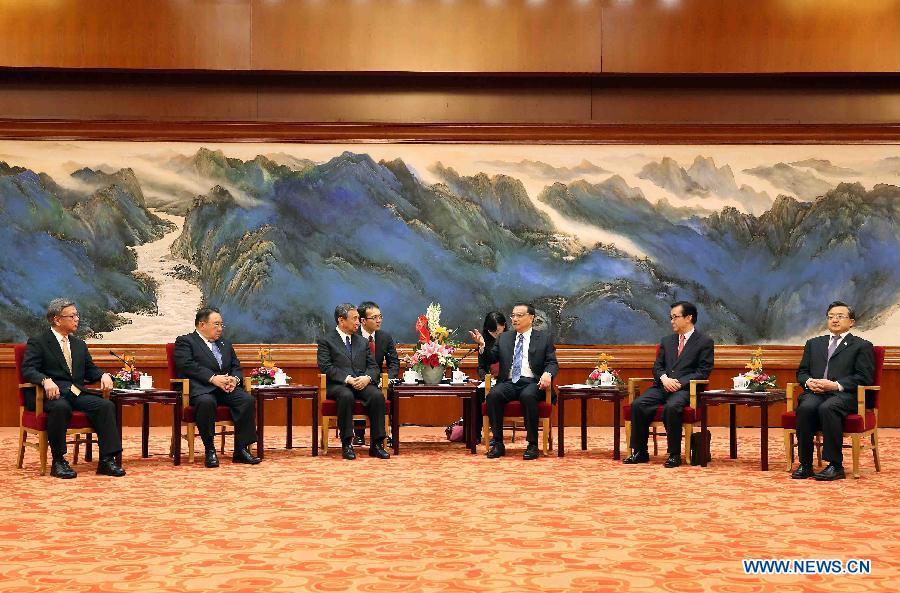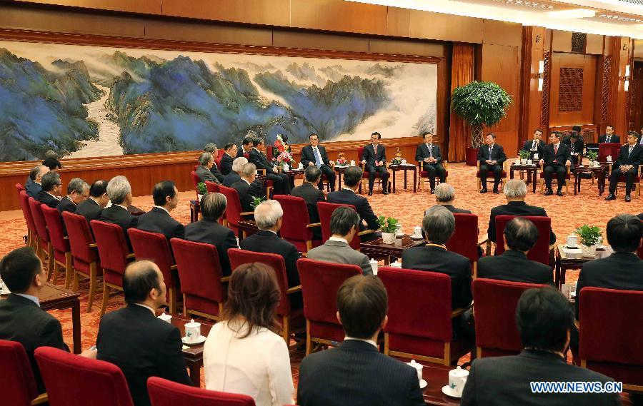 Chinese Premier Li Keqiang (R) meets with Yohei Kono, president of the Japanese Association for the Promotion of International Trade, and a large delegation from Japanese economic circles in Beijing, capital of China, April 14, 2015. (Photo: Xinhua/Liu Weibing)