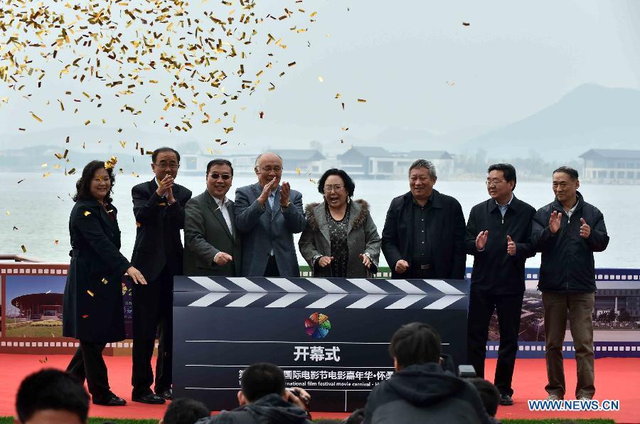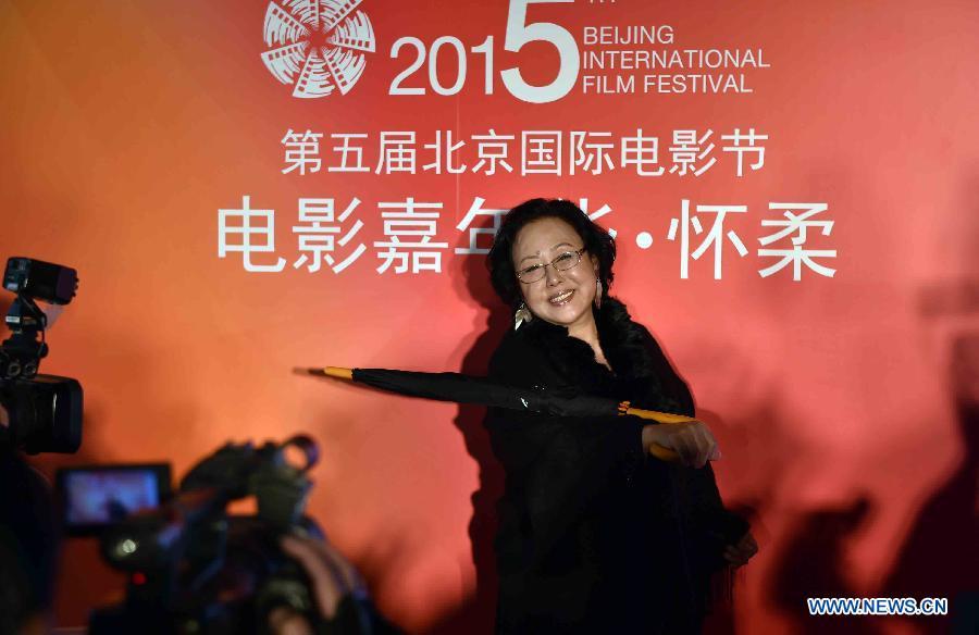 Actress Siqin Gaowa attends the opening ceremony of the film carnival of Beijing International Film Festival at the Yanqi Lake scenic area in Beijing, capital of China, April 15, 2015. The fifth Beijing International Film Festival will be held in Beijing from April 16 to 23. (Photo: Xinhua/Li Wen)