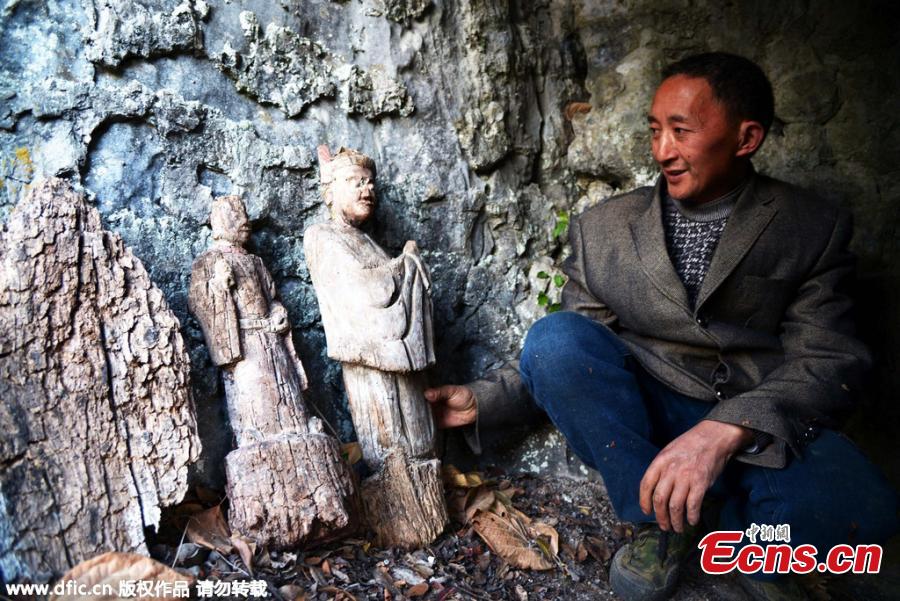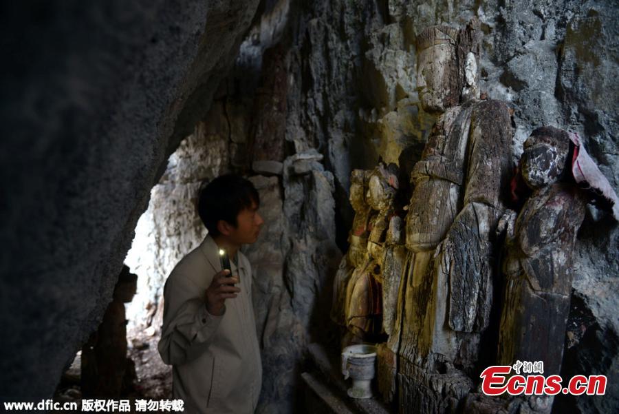 Wooden sculptures were discovered on a cliff in Yunyang county, Southwest China’s Chongqing municipality, April 13, 2015. Most of the 12 wooden sculptures found were well preserved, but the gold-plate layer has already decayed. (Photo/IC)