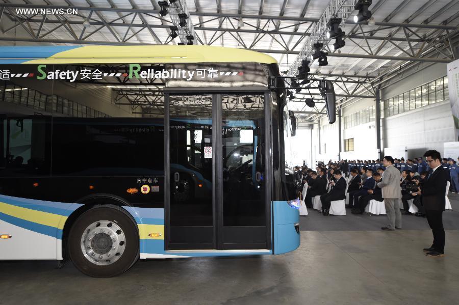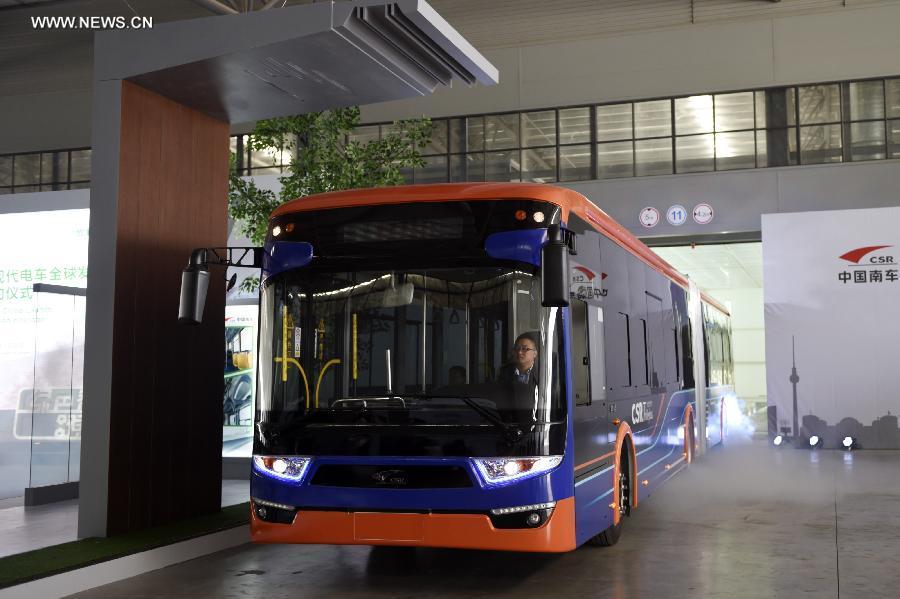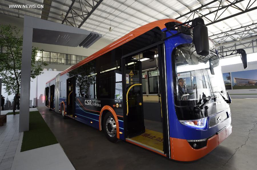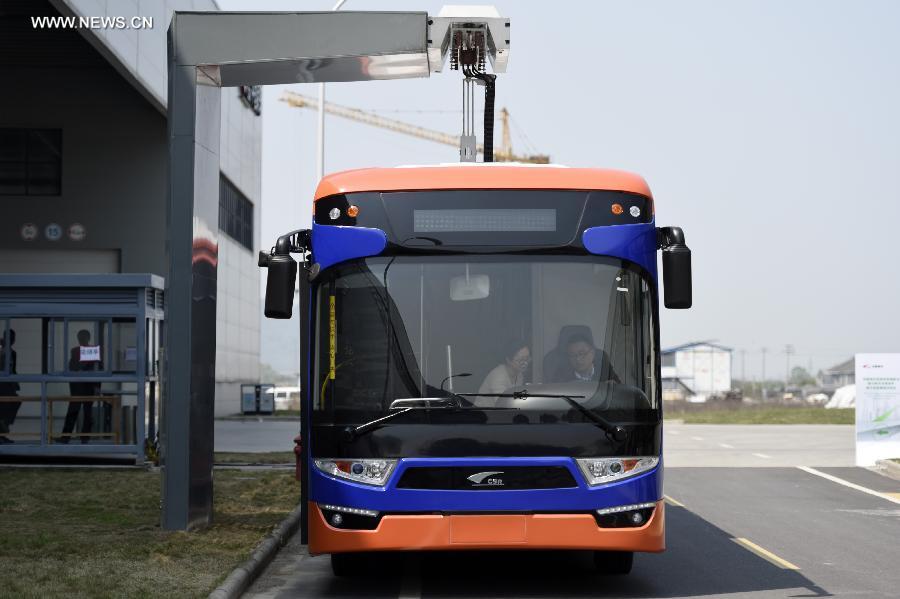 Photo taken on April 16, 2015 shows a 12-meter-long trolley bus with super capacitor at the Ningbo base of China South Railway (CRS) in Ningbo, east China's Zhejiang province. Trolley buses with super capacitor featured high power start-up, quick charge and high recycling efficiency. They will be fully charged at a bus station within 30 seconds and running over 5 kilometers. The service life for such a trolley bus will last as long as 12 years. (Xinhua/Ju Huanzong)
