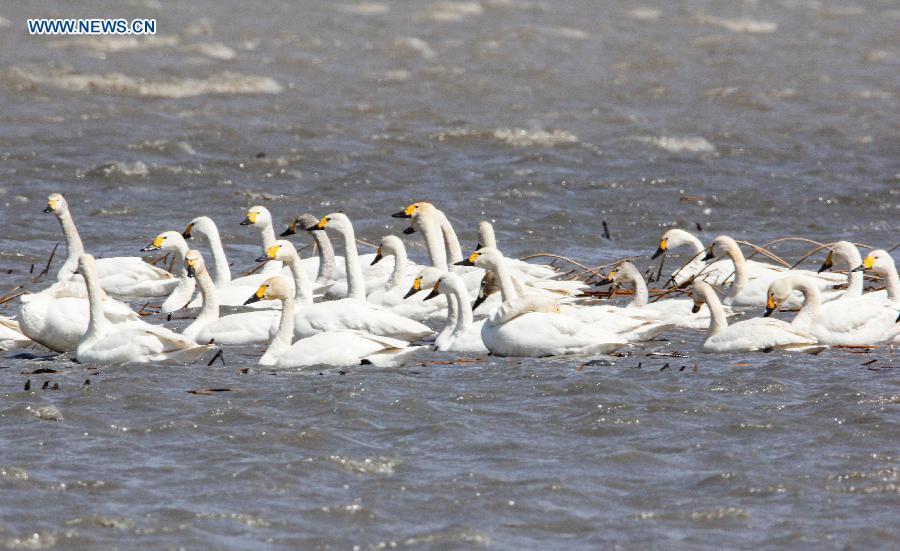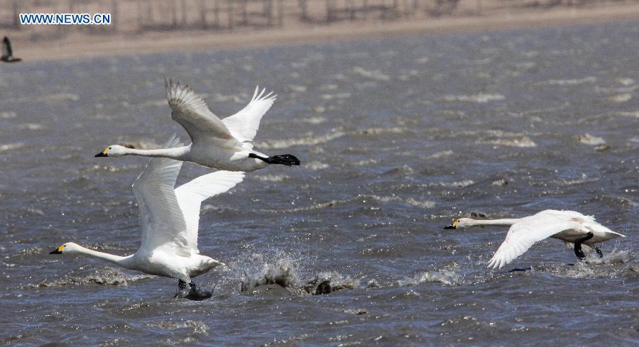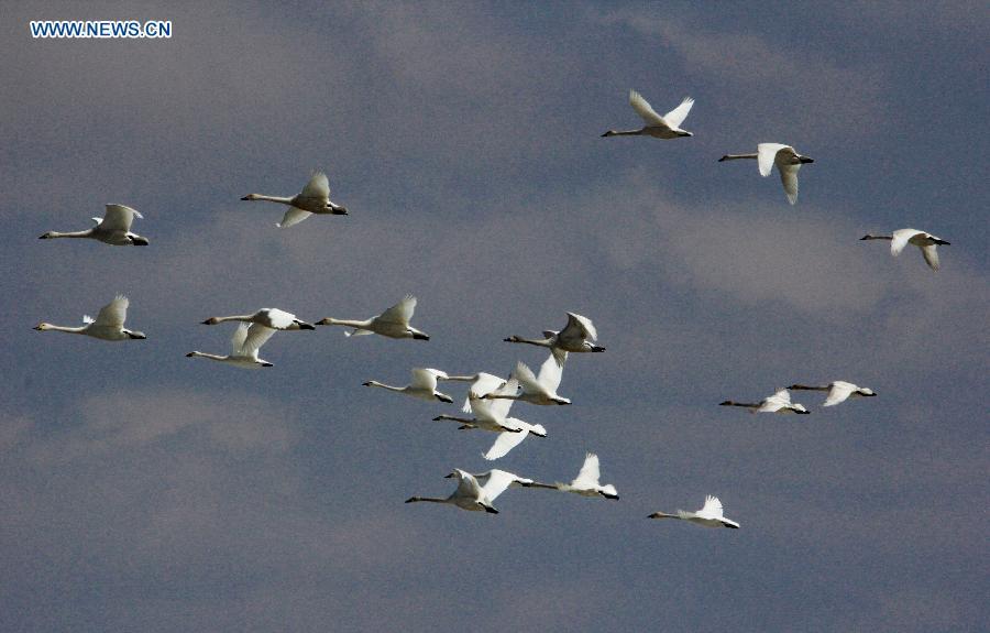 Swans fly over a river in Datan Town in Man Autonomous County of Fengning, north China's Hebei province, April 16, 2015. Better environment here has attracted an increasing number of swans in recent years. (Photo: Xinhua/Chen Qijia)