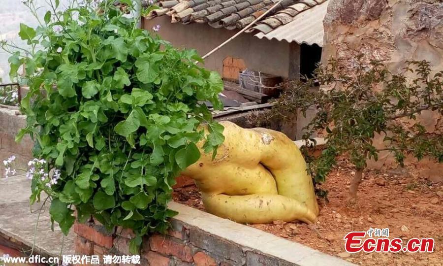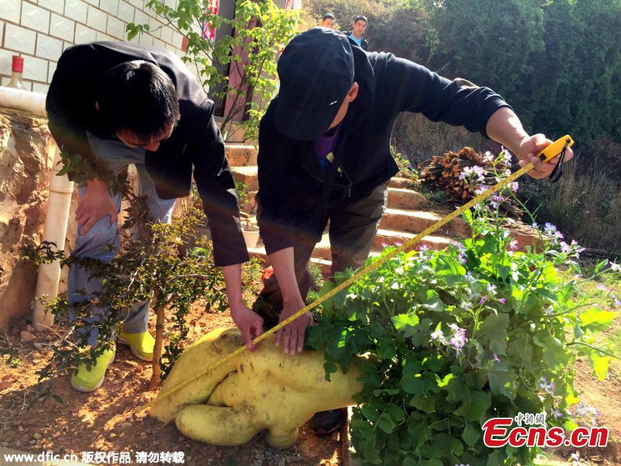 A giant white radish grows outside a farmer’s house in Eshan county, Southwest China’s Yunnan province, April 17, 2015. The root vegetable, which has grown to about 1.2 meters long and weighs about 15 kg, has attracted many visitors. (Photo/IC)