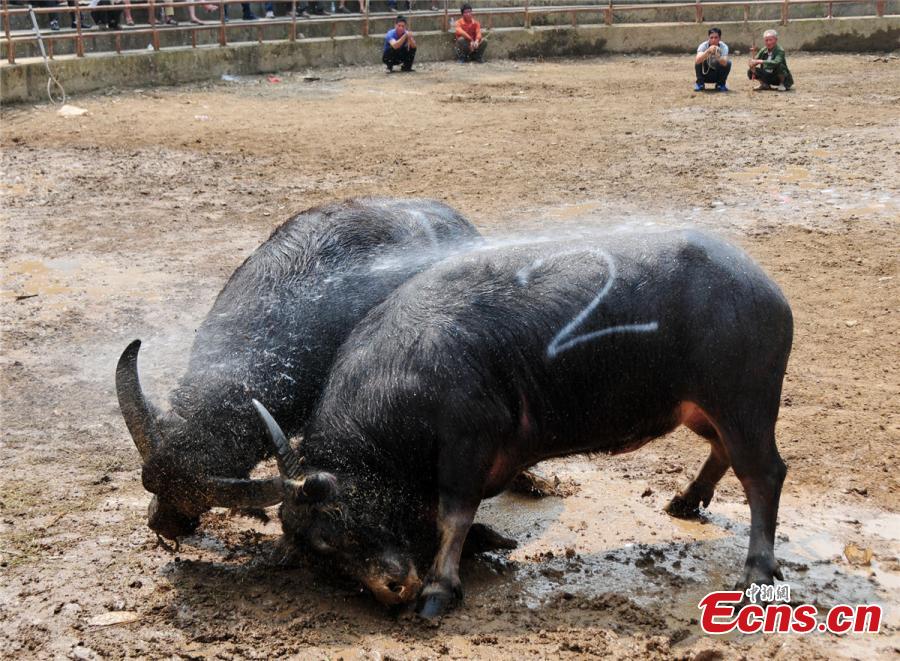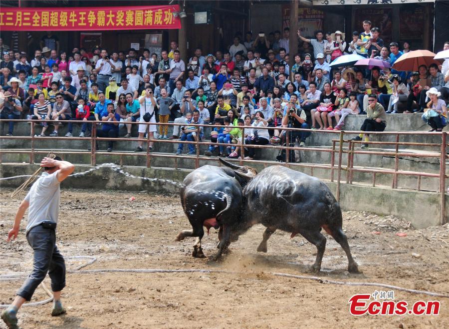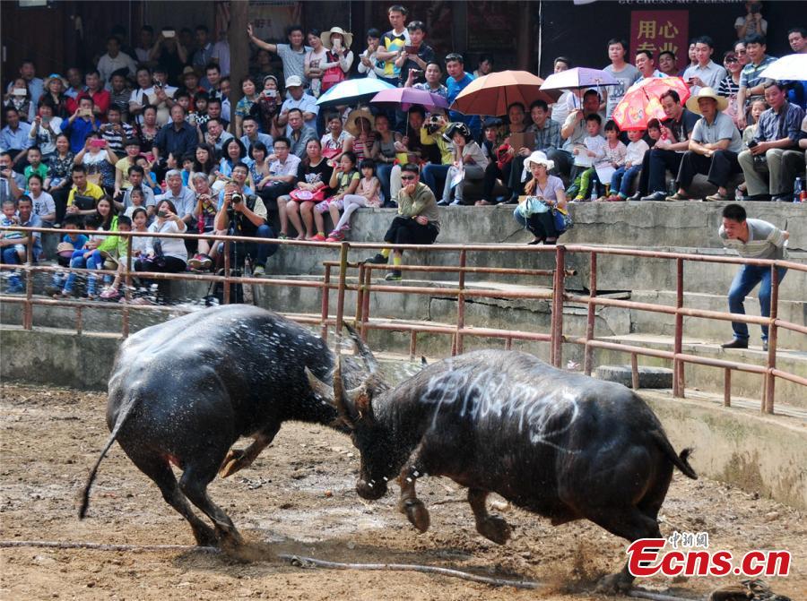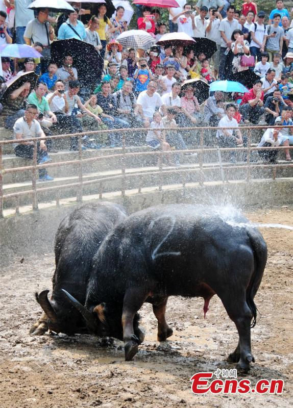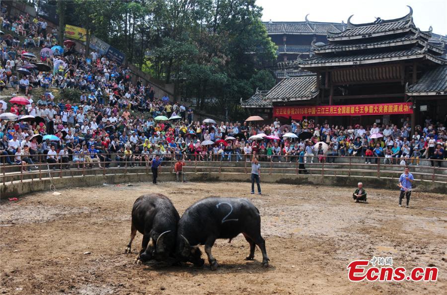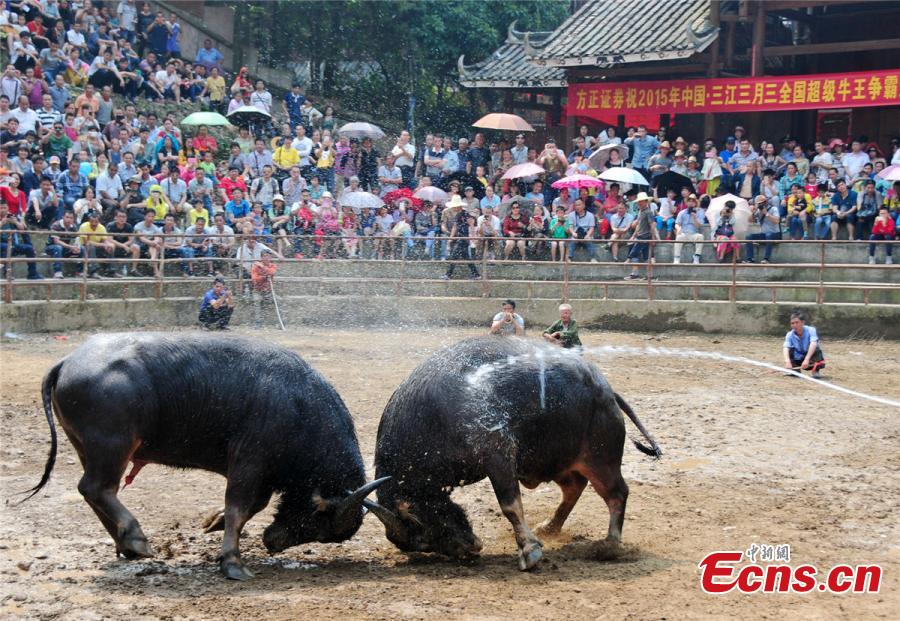 A water buffalo fight is held to celebrate a folk festival at Sanjiang Dong autonomous county, Southwest China’s Guangxi Zhuang autonomous region, April 19, 2015. Nearly 100 water buffalos from about five provinces participated in the 3-day contest. Dong people have the tradition to organize water buffalo fights for festivals, before spring farming or after autumn harvest. (Photo: China News Service/Gong Pukang)
