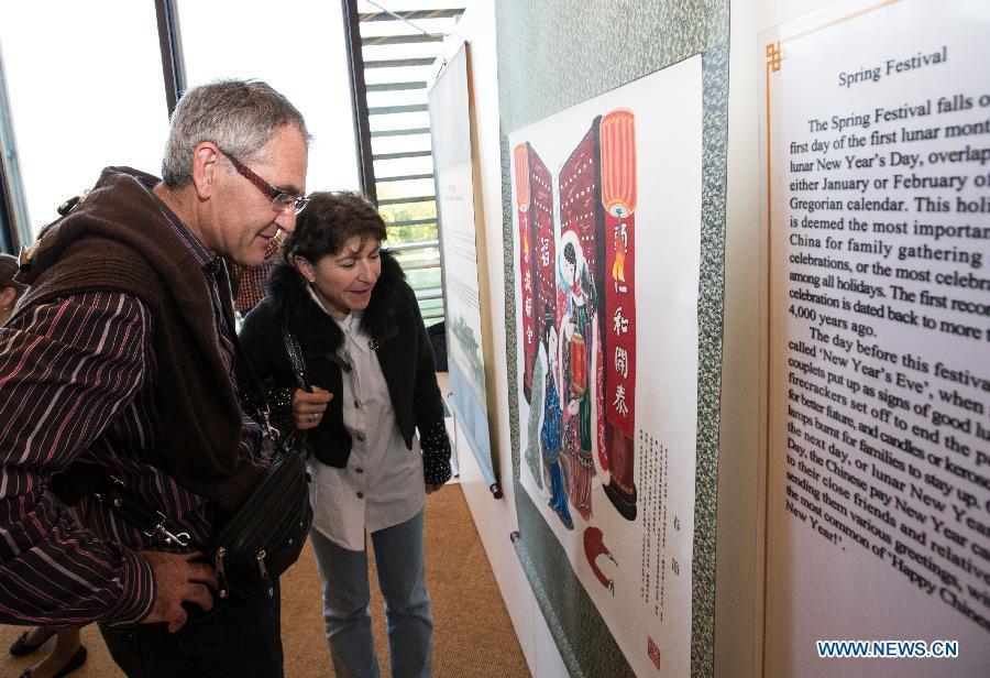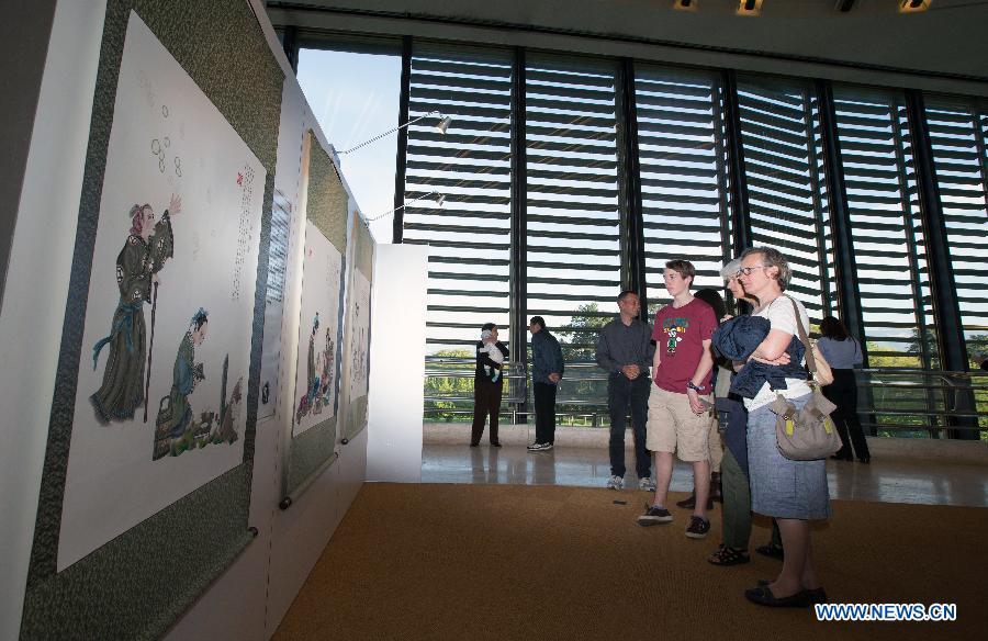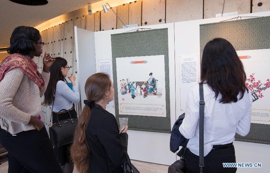 People watch Chinese paper-cut works during an exhibition in Geneva, Switzerland, April 20,2015. Hundreds of guests participated in a "Chinese Etiquette" paper-cut exhibition, co-organized by the United Nations Office at Geneva and the Chinese Permanent Mission to UN at Geneva, as part of the celebrations for the UN Chinese Language Day. (Photo: Xinhua/Xu Jinquan)
