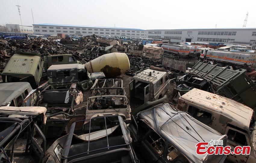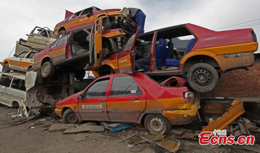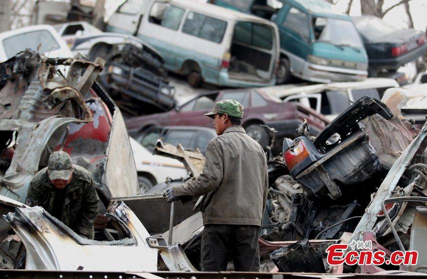 A man works in a scrapped car yard in Changchun city, Northeast China’s Jilin province, April 21, 2015. The city receives 20,000 more scrapped cars each year, but can only dismantle a maximum of 5,000. (Photo/CFP)