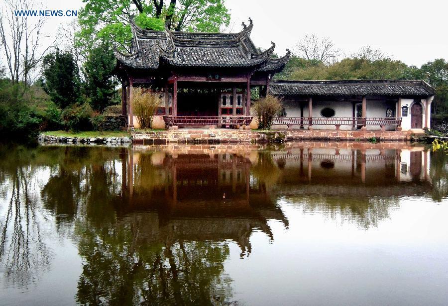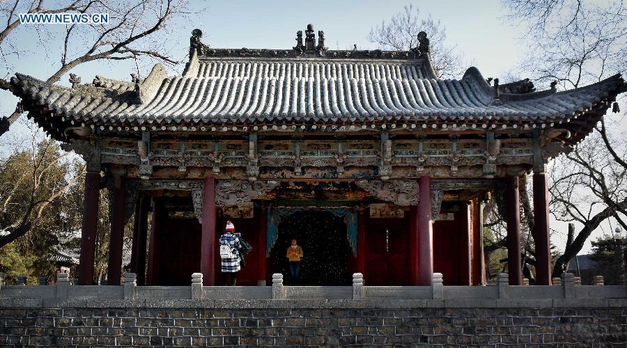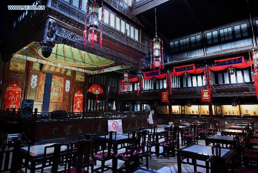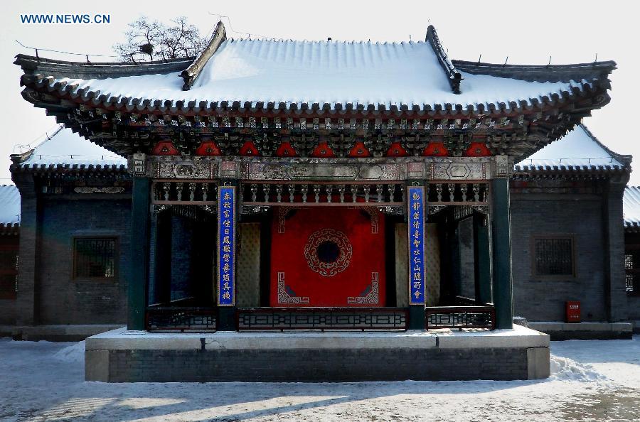 Photo taken on March 5, 2015 shows the stage of Guangdong Guild Hall in north China's Tianjin Municipality. China's performing stage is an essential part of traditional Chinese architecture. Most well-preserved ancient stages were built in Ming Dynasty (1368-1644) and Qing Dynasty (1644-1911). It generally consists of indoor and outdoor types. The main construction materials are wood, brick and stone. Its unique acoustics property has become an important object for experts. (Photo: Xinhua/Wang Song)