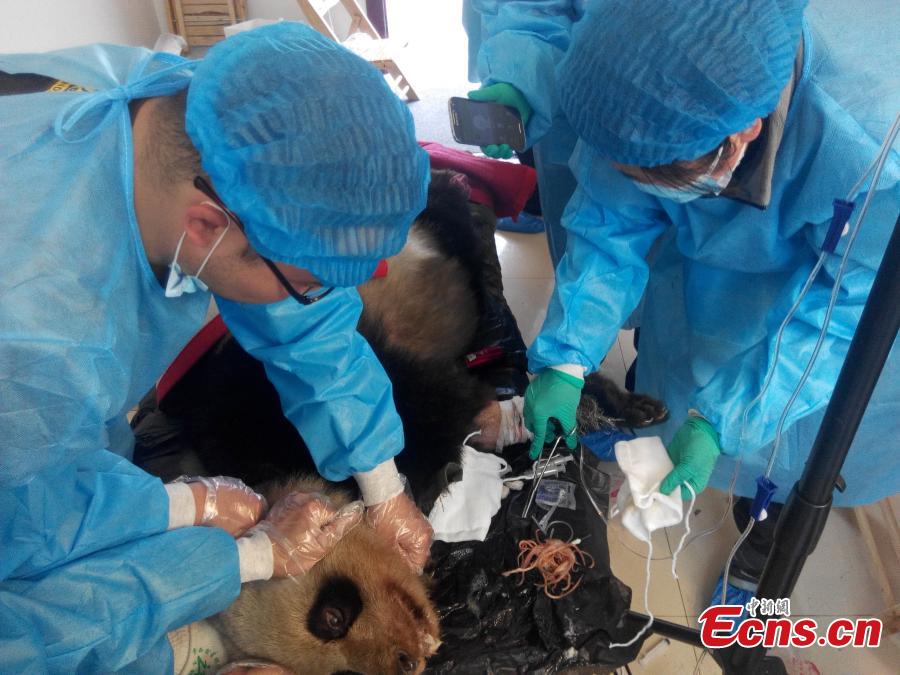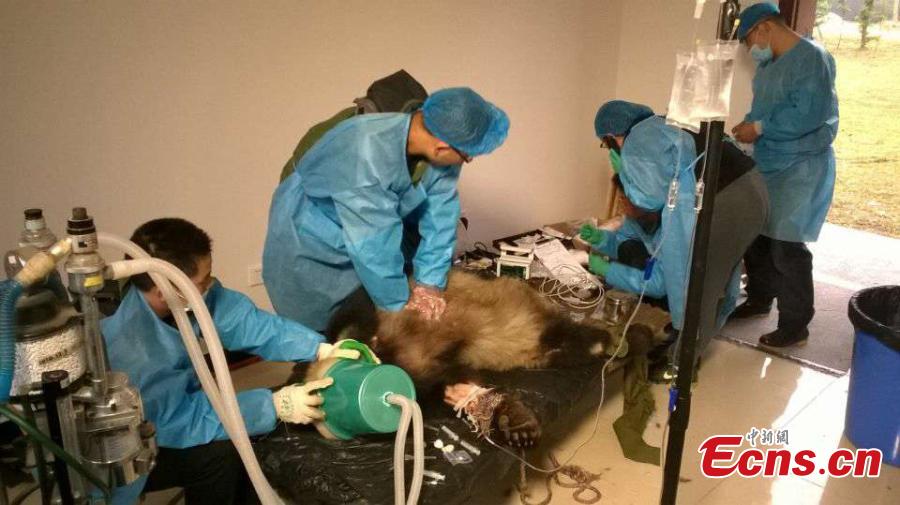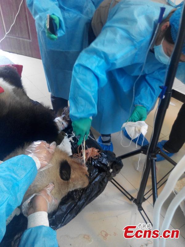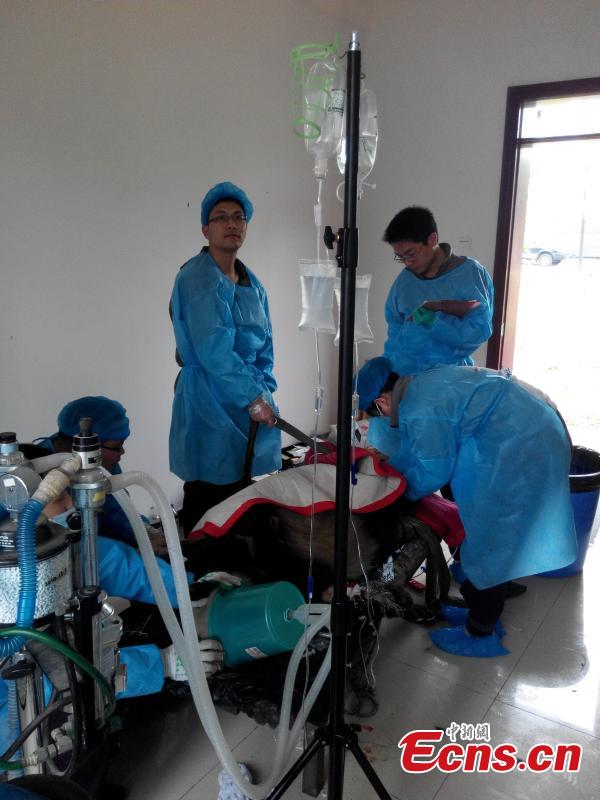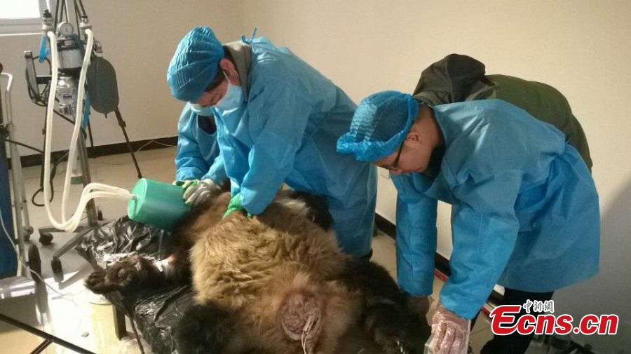 A giant panda receives treatment at the Chengdu Research Base of Giant Panda Breeding in Southwest China’s Sichuan province, April 22, 2015. The panda was found critically ill at a nature reserve and still suffers from ailments including an infection, anemia, and malnutrition, although it is now out of danger. (Photo provided to China News Service)
