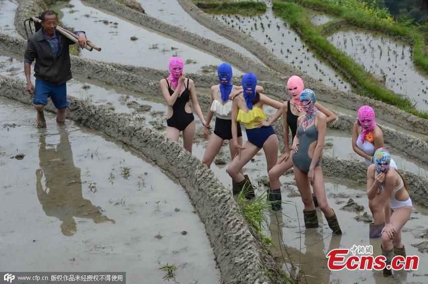 Models wearing face-kinis pose in a terraced field at a scenic spot in Xinhua county, Central China’s Hunan province, April 22, 2015. The scenic spot held an activity to mark Earth Day on Wednesday and to promote its tourism resources. It has become a fad at many beaches for swimmers to put on fabric masks to protect their entire head and neck from burning sunlight. (Photo/CFP)