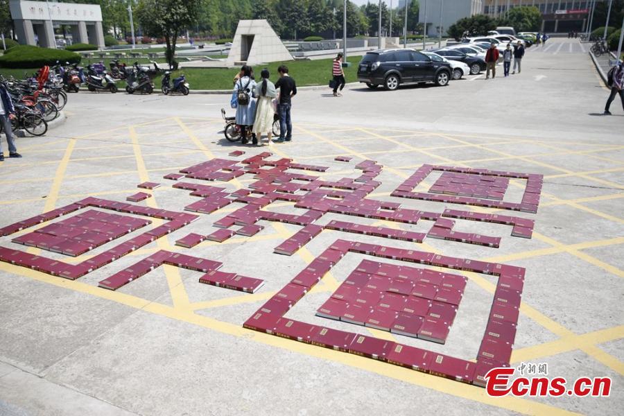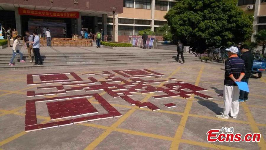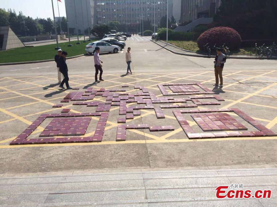 A QR code for the Chinese character shu (book) is created to mark World Book and Copyright Day on the campus of Nanjing University of Science and Technology in Nanjing, East China’s Jiangsu province, April 23, 2015. The QR code covers an area of 36 square meters, and aims to encourage students to use the university’s digital library. (Photo provided to China News Service)