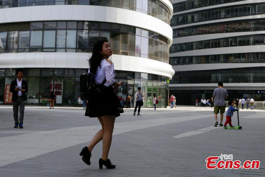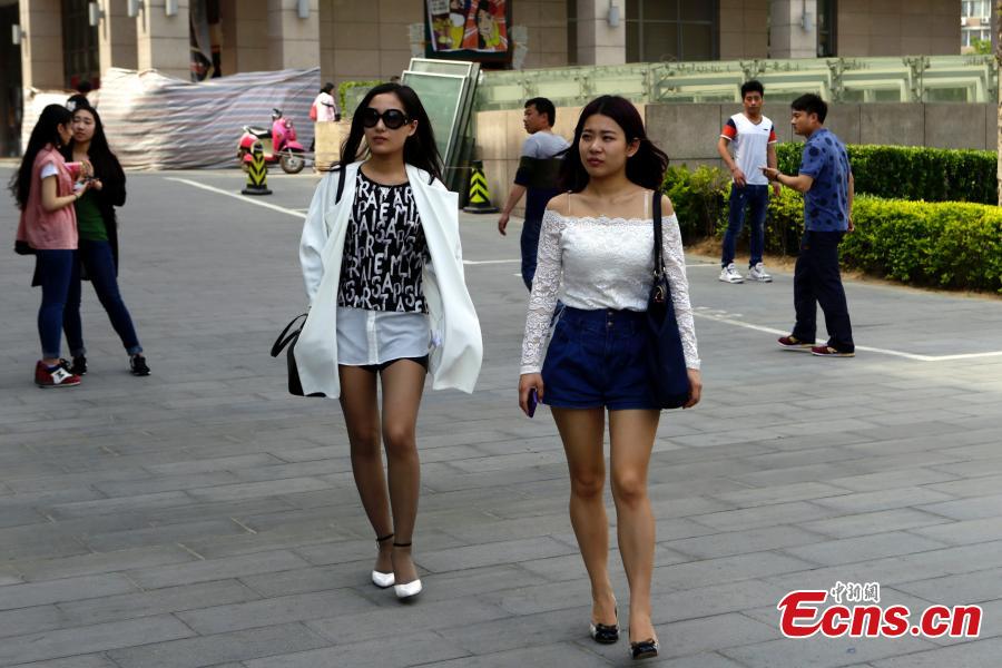 People wearing summer outfits walk in Beijing on April 25, 2015. The temperature in the Chinese capital city went up to above 30 degrees Celsius on Saturday. (Photo: China News Service/Li Huisi)