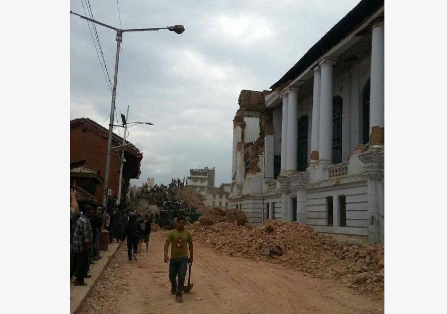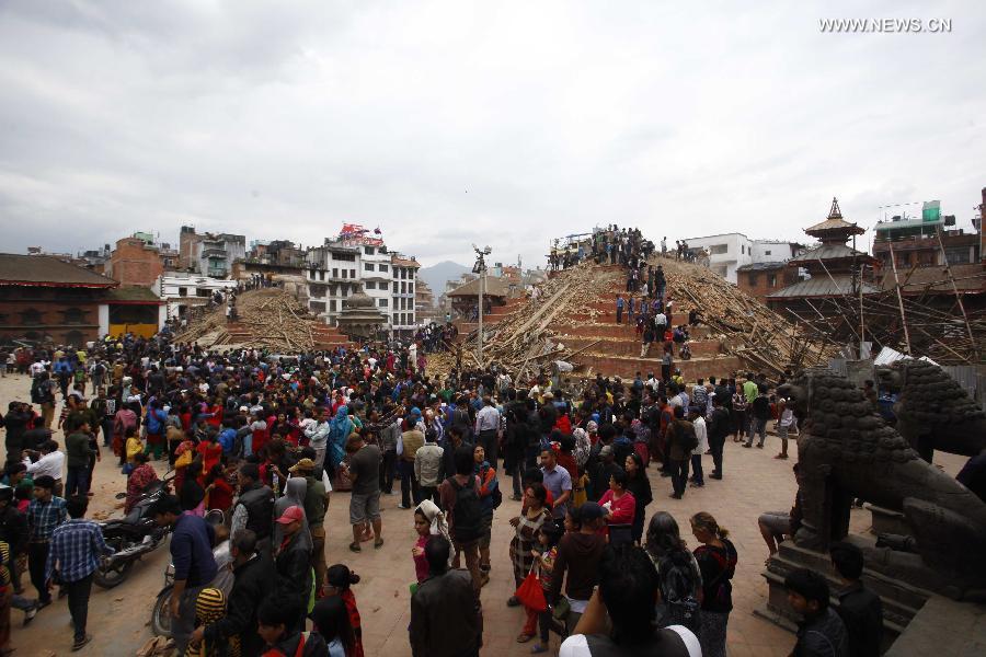 The combo photo shows the nine-story Dharahara Tower, one of Kathmandu's landmarks built by Nepal's royal rulers as a watchtower in the 1800s and a UNESCO-recognized historical monument, July 28, 2013 (above) and the ruins of the tower after an earthquake in Kathmandu, capital of Nepal, on April 25, 2015. (Photo/Xinhua)