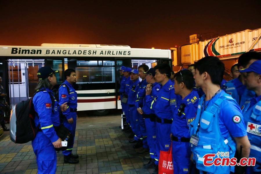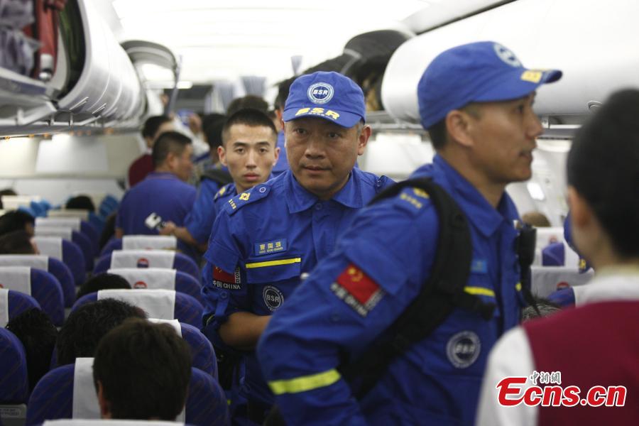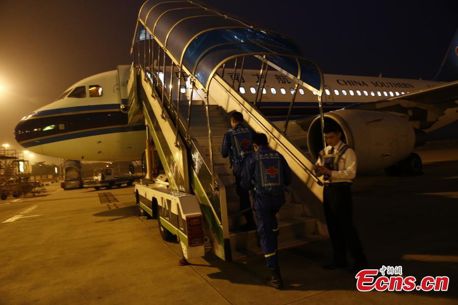 Members of the Blue Sky Rescue Team under the Red Cross Society of China board a plane in Guangzhou, Guangdong province, April 26, 2015. The members left Guangzhou on Sunday evening to take part in relief efforts in the quake-hit Nepal. (Photo: China News Service/Zhang Hao)