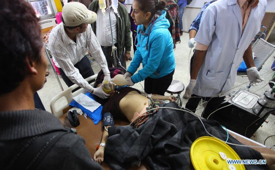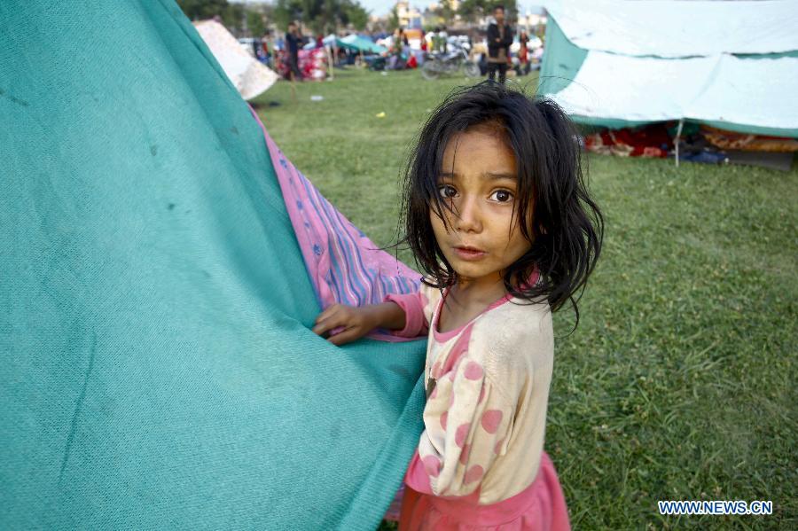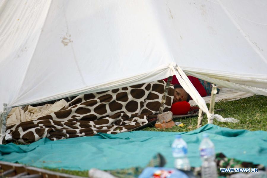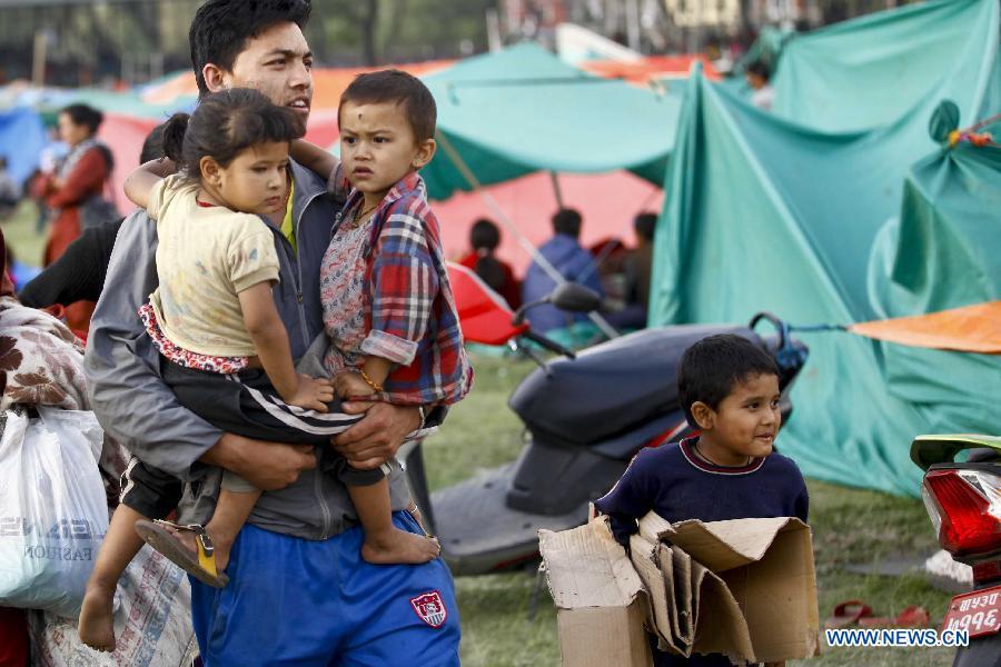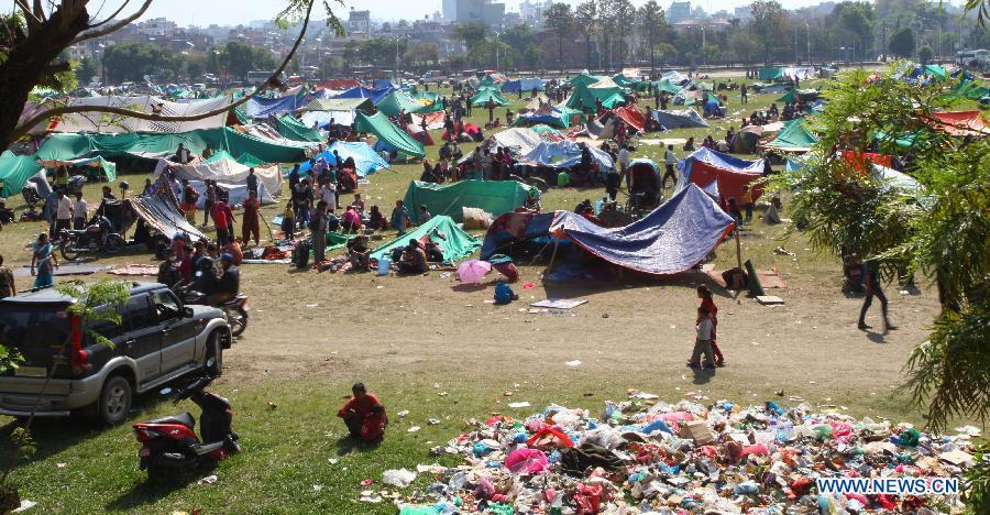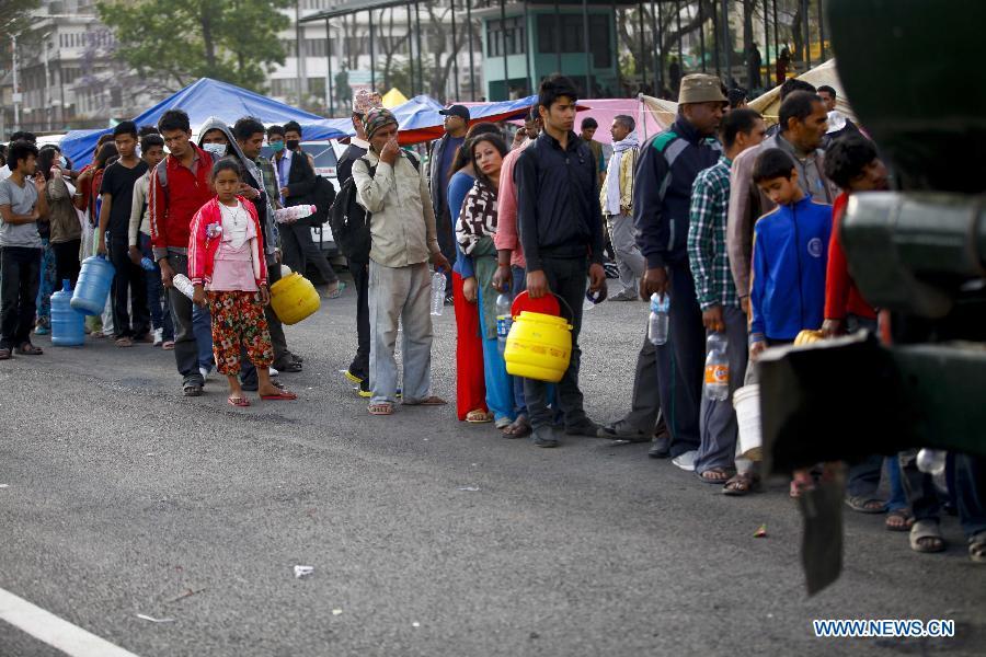 People queue up for water at the Army Pavilion in Tundikhel, Kathmandu, Nepal, April 26, 2015. A total of 3,351 people had been killed and about 6,500 others injured in the powerful earthquake that struck Nepal at midday Saturday, the authorities said Monday morning. (Photo: Xinhua/Pratap Thapa)