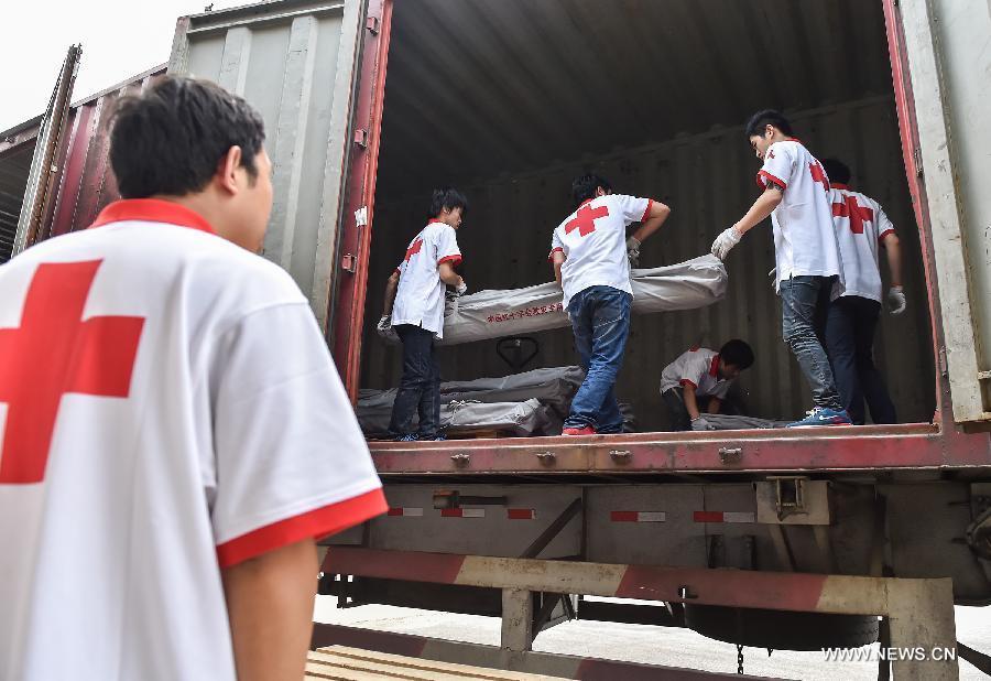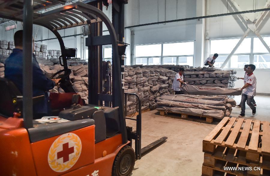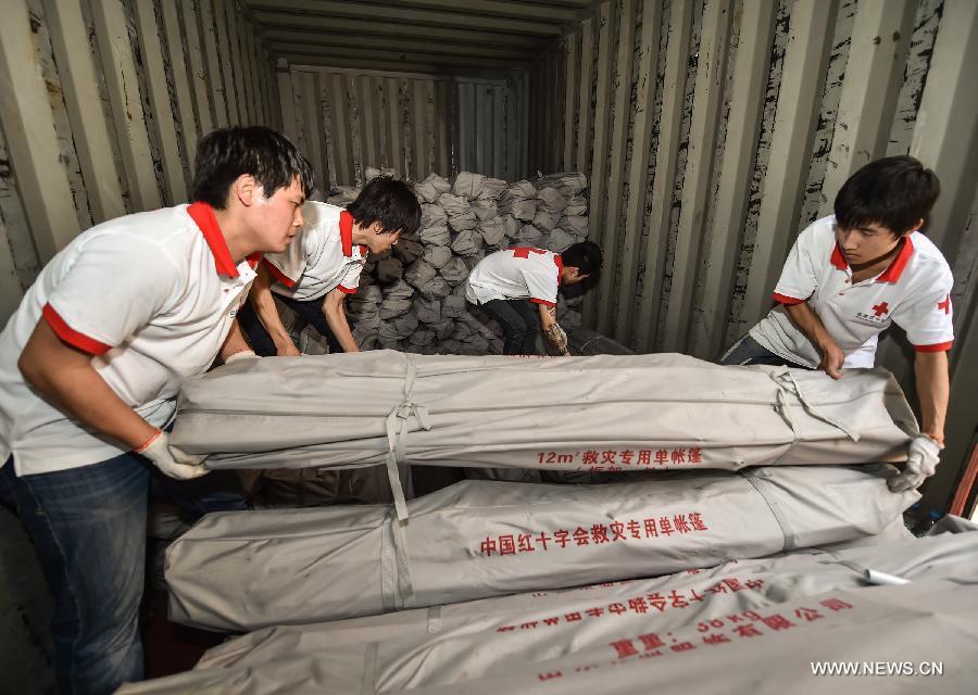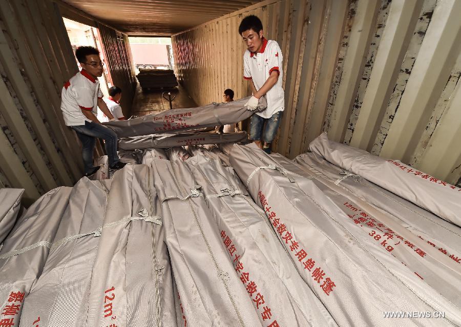 Staff members load relief materials onto a vehicle in Beijing, capital of China, April 27, 2015. The Red Cross Society of China started to deliver the first batch of relief supplies to earthquake-stricken Nepal from Beijing on Monday. An 8.1-magnitude quake shook Nepal at 2:11 p.m. (Beijing Time), killing more than 2,000 people and injuring another 5,460 in Nepal. The quake also affected the southwestern part of China's Tibet. Some 24,800 people have been relocated in Xigaze City. (Photo: Xinhua/Li He)