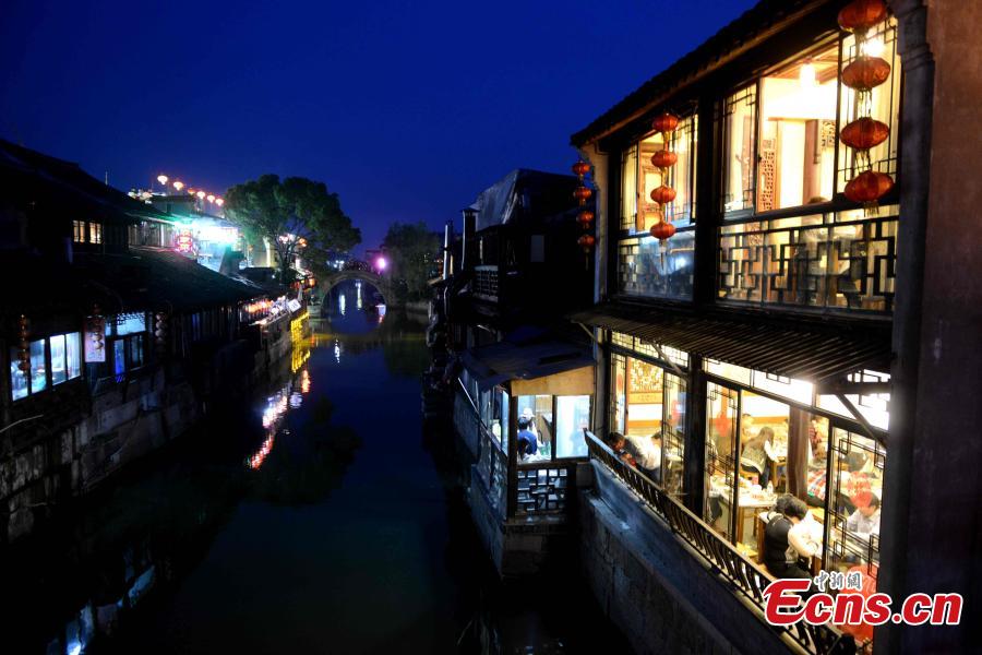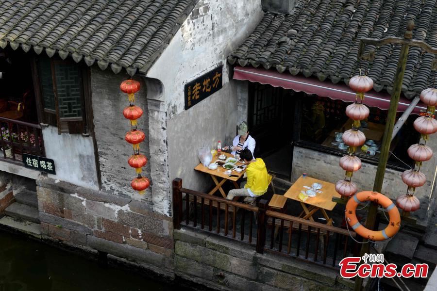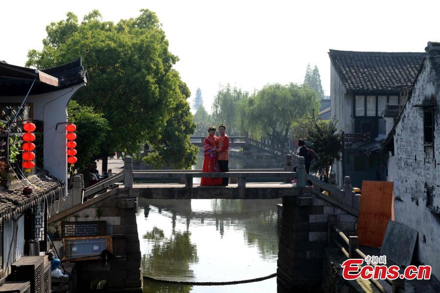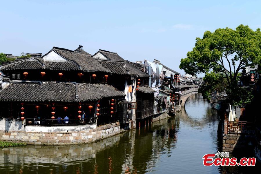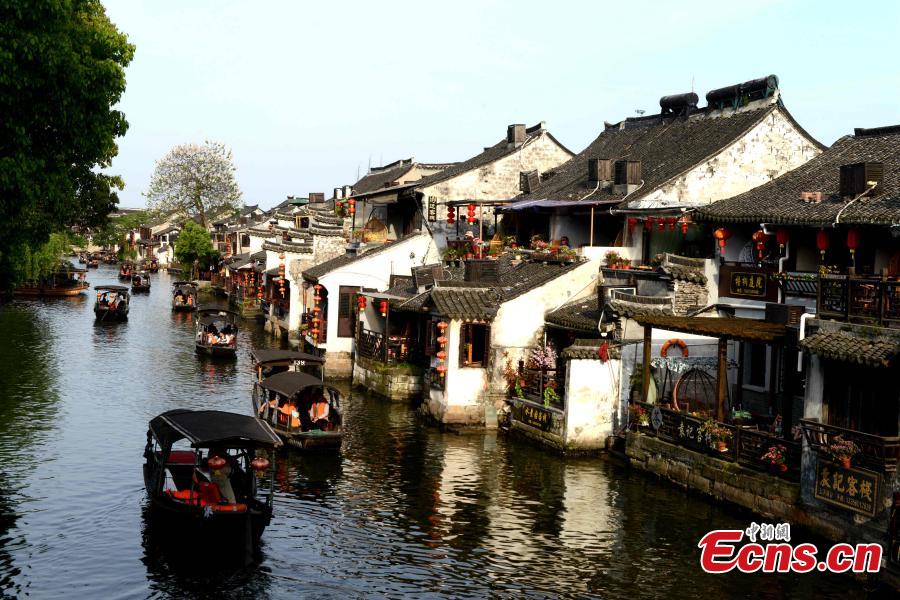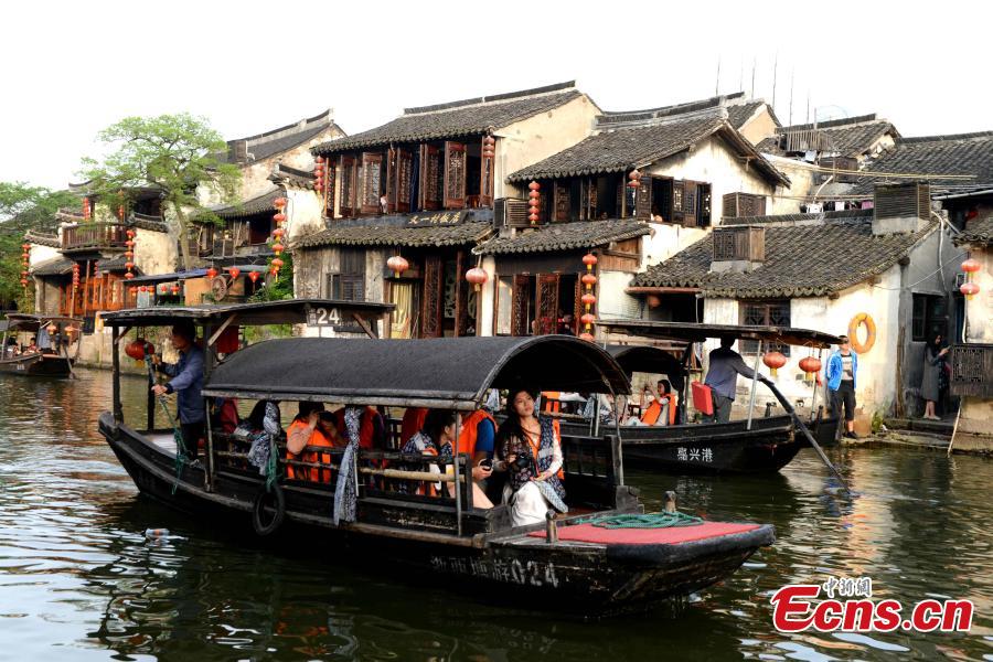 A view of Xitang ancient town in Jiashan county, East China’s Zhejiang province. As early as the Spring and Autumn and Warring States Periods (770-221B.C.), Xitang was a place of strategic importance on the boundary between the Wu and Yue States. The town boasts old bridges, narrow lanes, canopy corridors, and clusters of traditional architecture. It received more than 6.53 million tourists in 2014, and visitors are starting to arrive now before the upcoming holiday from May 1 to 3. (Photo: China News Service/Wang Dongming)