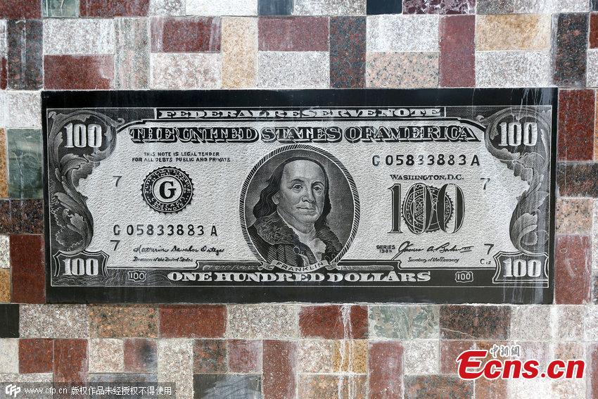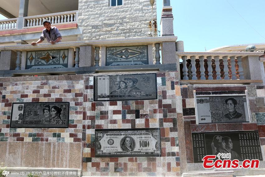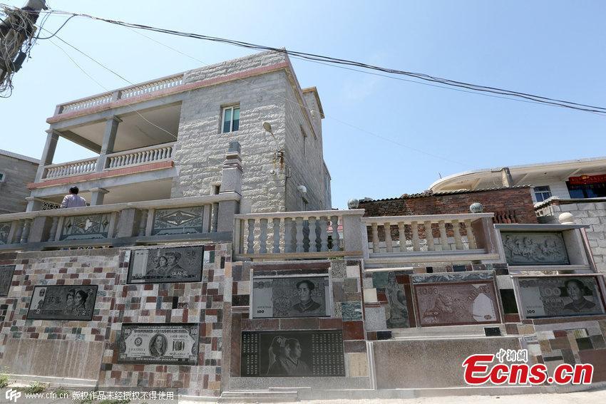 Images of banknotes including Chinese yuan and a US dollar were carved on the wall of a residential building in a village of Quanzhou city, Fujian province, April 1, 2015. The house owner built the wall last year and the whole project cost him 30,000 yuan ($4,830). (Photo/CFP)