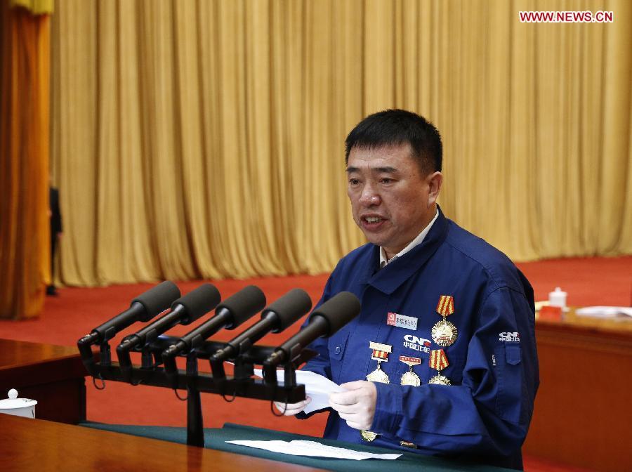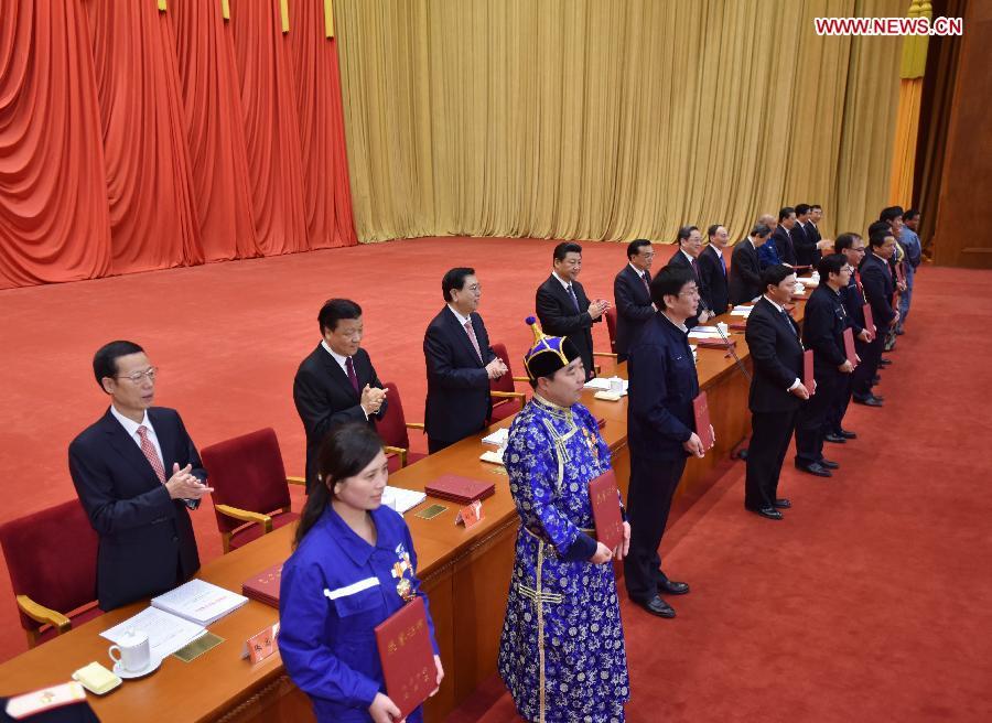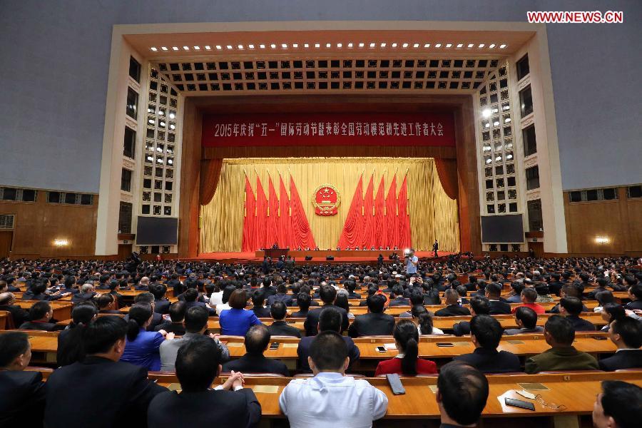 Chinese President Xi Jinping, Premier Li Keqiang and other senior leaders issue certificates of honor to national model workers during an award ceremony, which was held ahead of Worker's Day on May 1, in Beijing, capital of China, April 28, 2015. (Photo: Xinhua/Ju Peng)