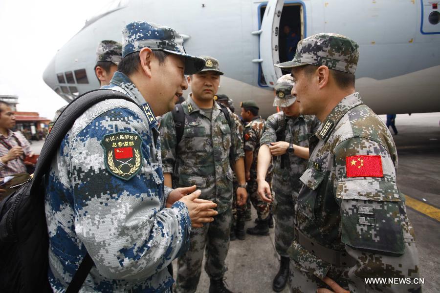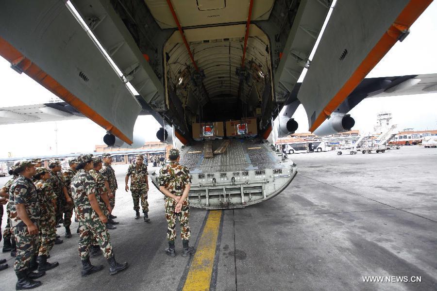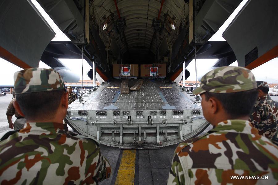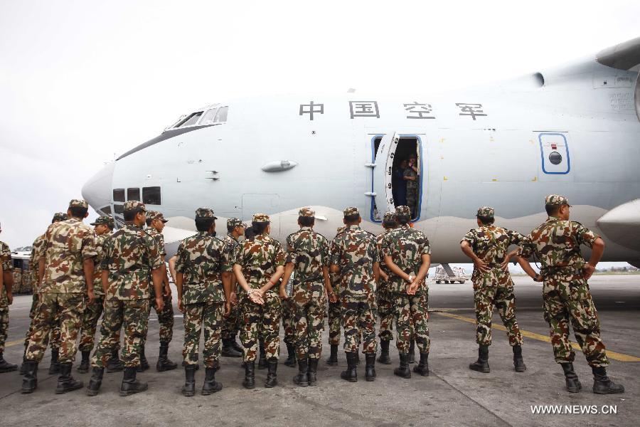 The first military plane carrying aid materials from the Chinese government has arrived in Kathmandu, Nepal's capital. The aid is part of 186 tons of aid pledged by China and includes tents, blankets and electric generators, which will be sent to Nepal in batches. The Chinese Foreign Ministry says 170 people from the military are also in Kathmandu to join the relief efforts and more will arrive. (Photo: Xinhua/Pratap Thapa)