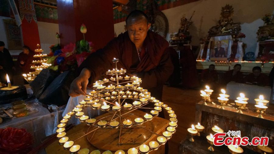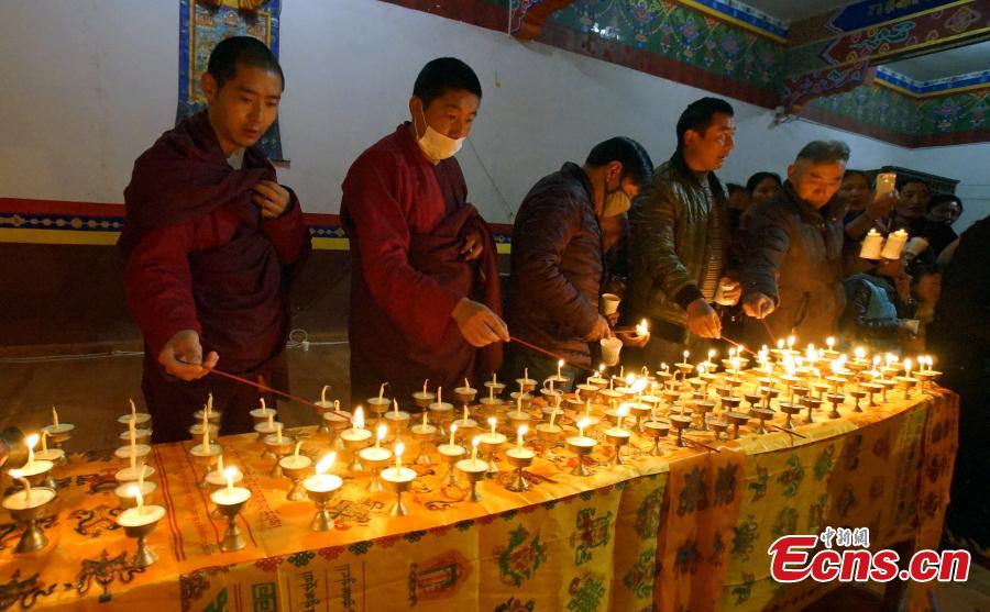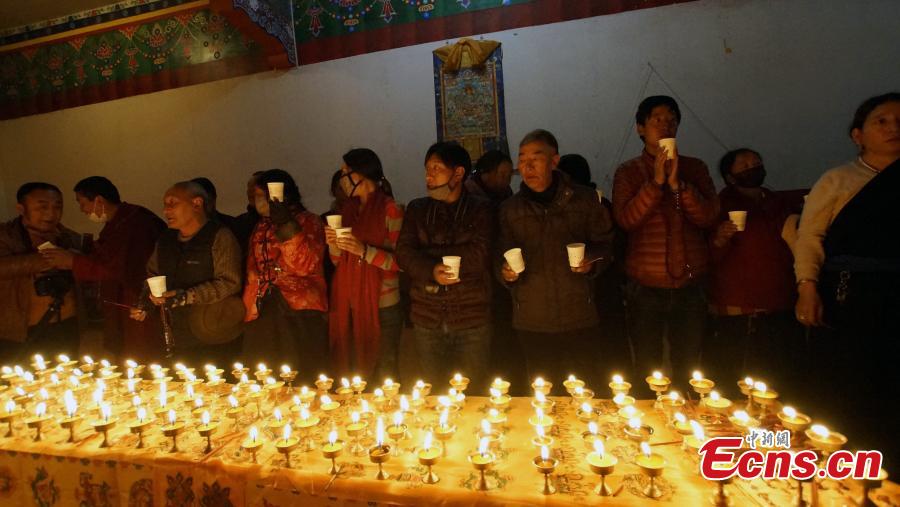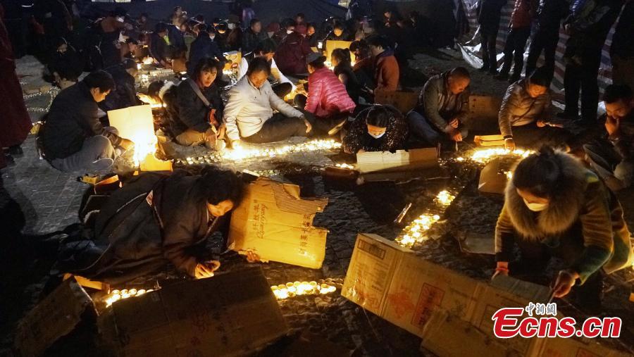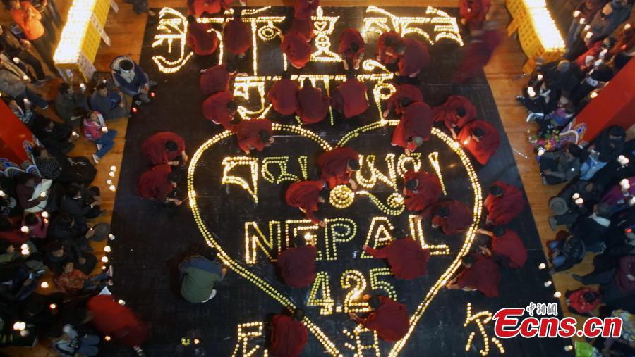 Tibetan monks lead Buddhists in prayer for the victims of the Nepal earthquake at a temple in Yushu Tibetan autonomous prefecture, Northwest China’s Qinghai province, April 28, 2015. A magnitude-7.1 earthquake hit Yushu on April 14, 2010, leaving nearly 3,000 people dead or missing. (Photo: China News Service/ Qiega)