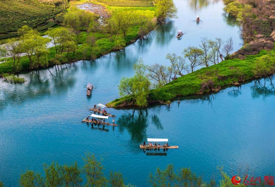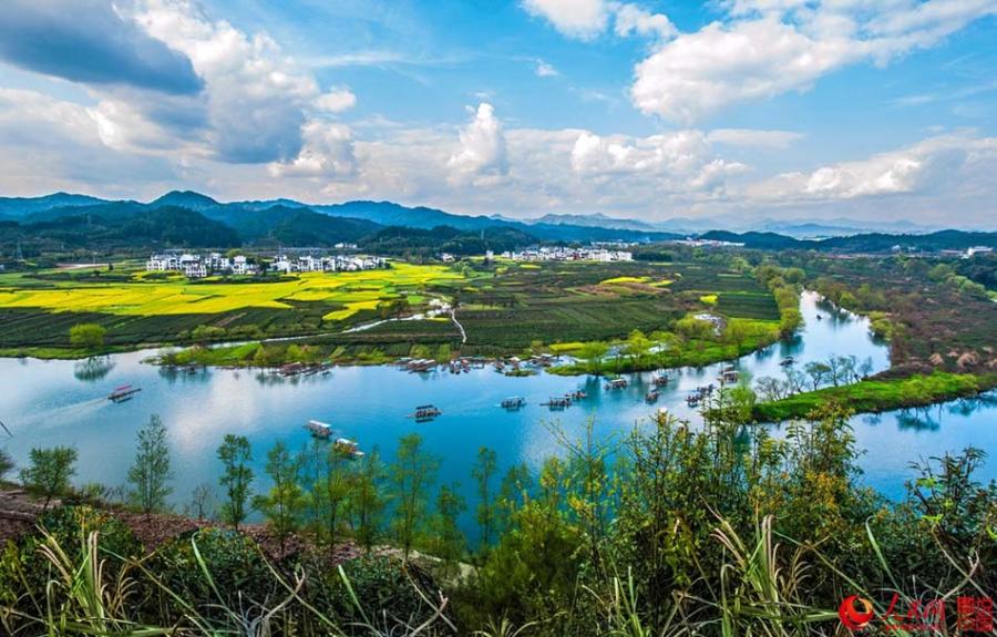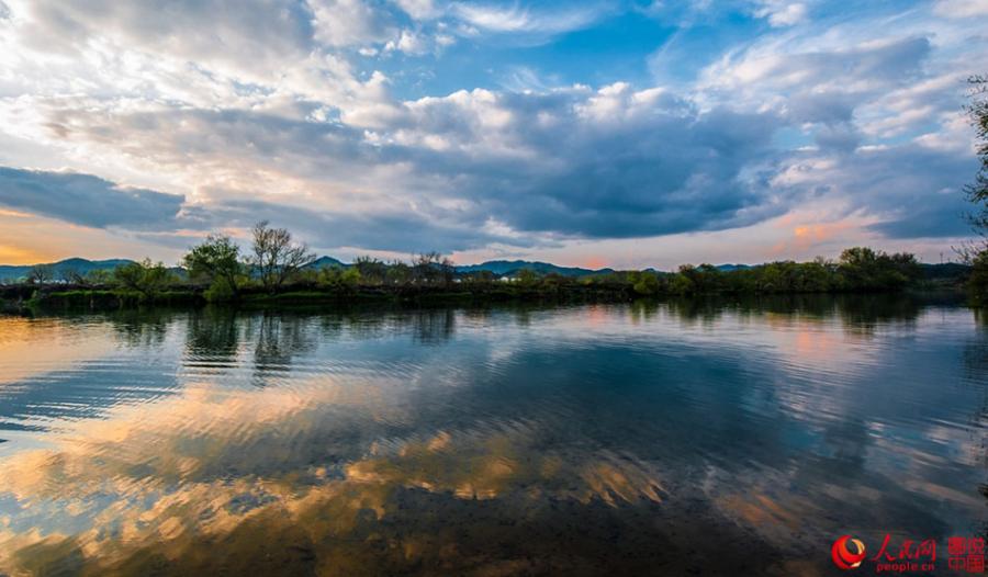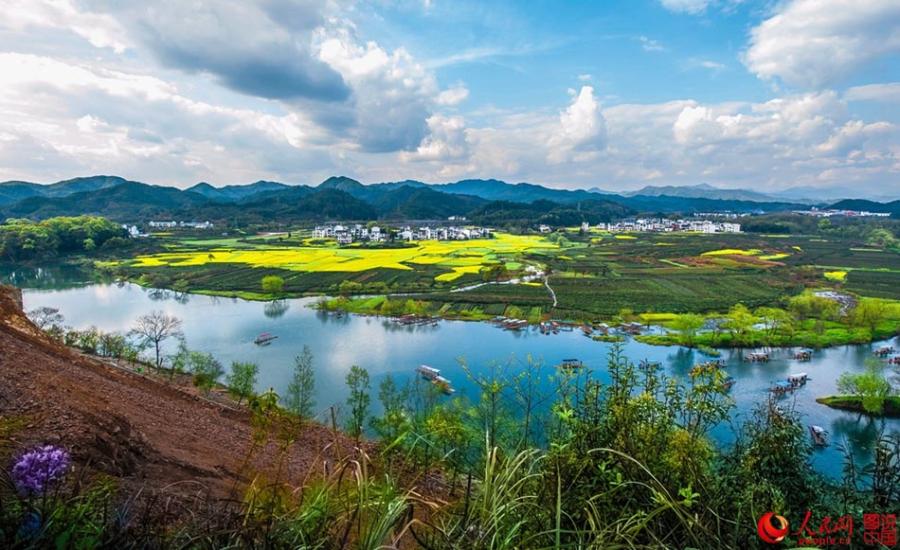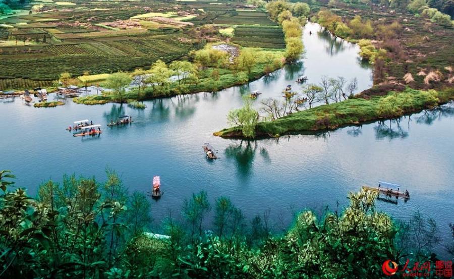 Beautiful scenery of the Moon Bay in Wuyuan county, southeast China's Jiangxi province. Moon Bay is about 700 meters to the east of Ziyang town in Wuyuan county, southeast China's Jiangxi province. The long and narrow island looks like a crescent moon. Thus, it is named the Moon Bay. The beautiful scenery of the Moon Bay has made it a good choice for many photography enthusiasts. (Photo/people.cn)