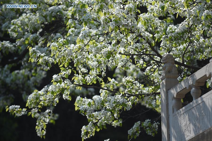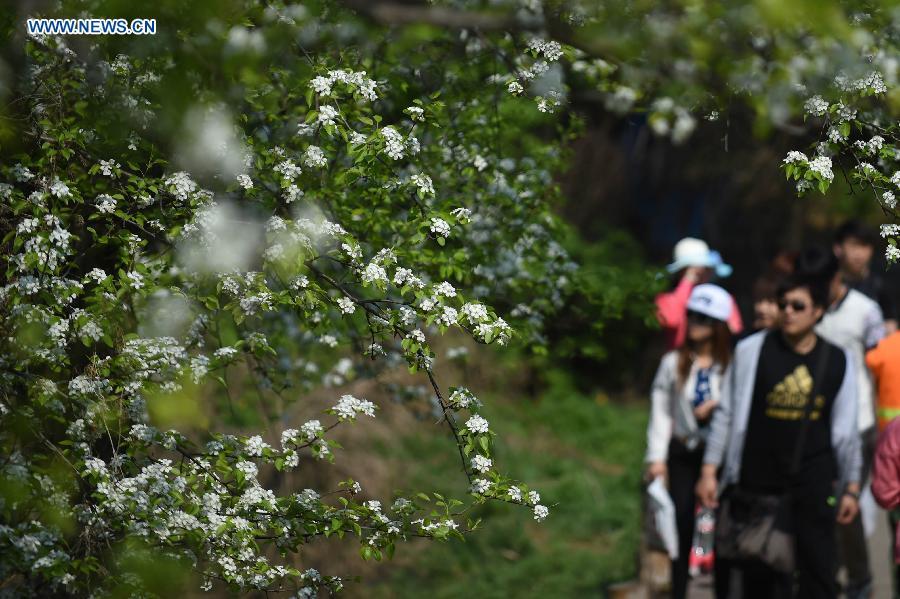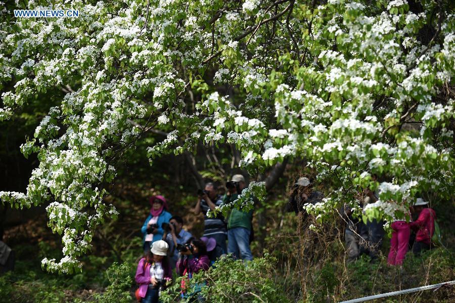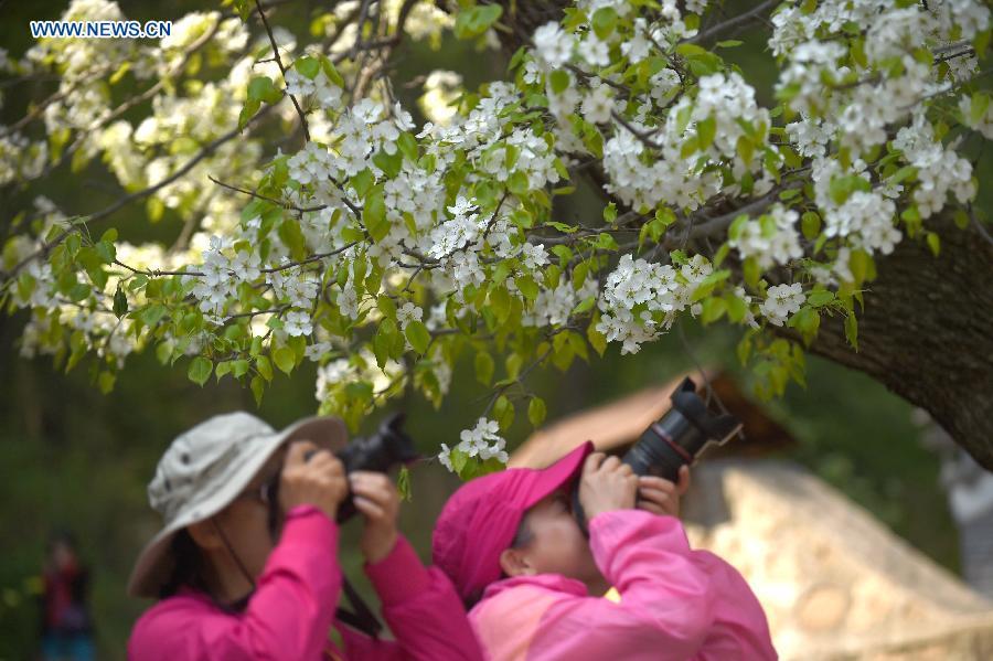 Tourists take pictures of pear blossom at Qianshan scenic spot in Anshan City, northeast China's Liaoning Province, April 29, 2015. (Photo: Xinhua/Pan Yulong)