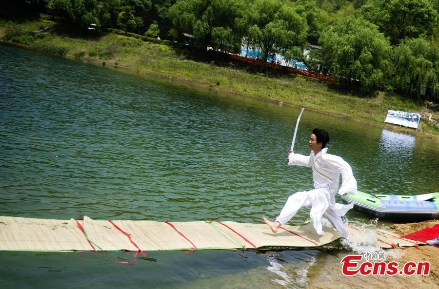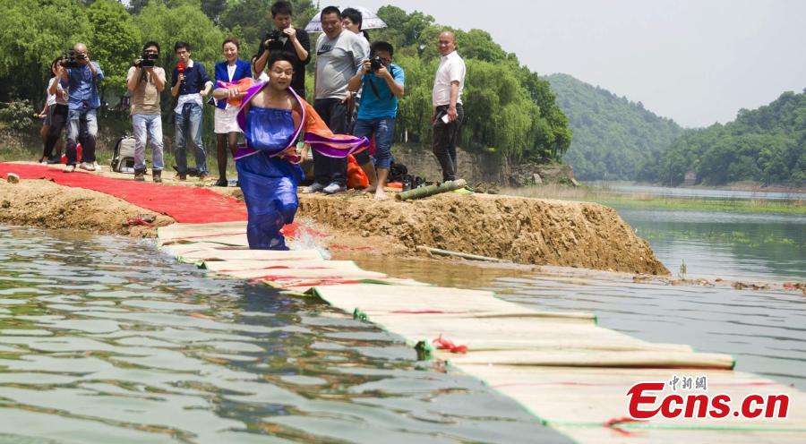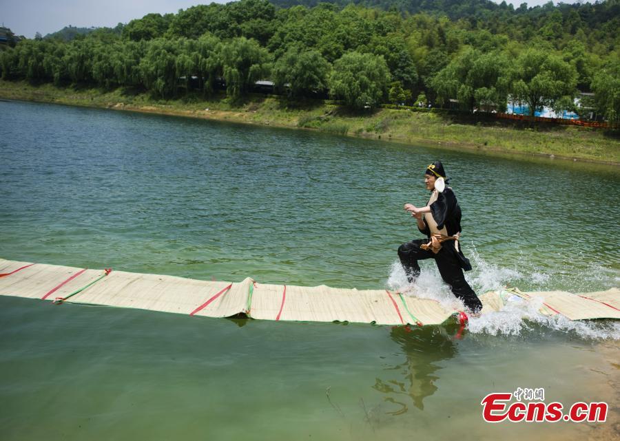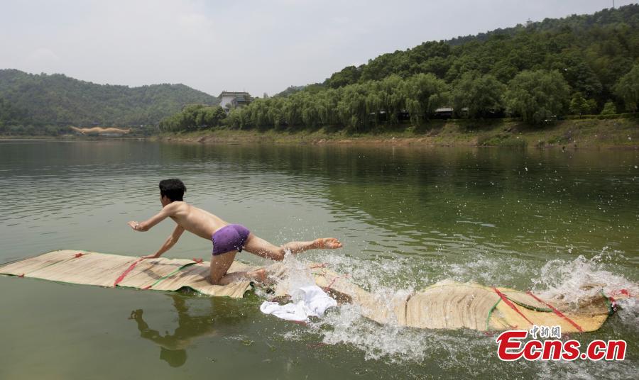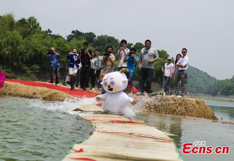 The "Floating in water" competition is held in Shiyan Lake in Changsha city, central China's Hunan province on April 28, 2015. People dressed in off-beat clothes ran on the 50-meter-long track, which was made of summer sleeping mats. The successful competitor would get 1,000 yuan ($161.2). (Photo: China News Service/Yang Huafeng)