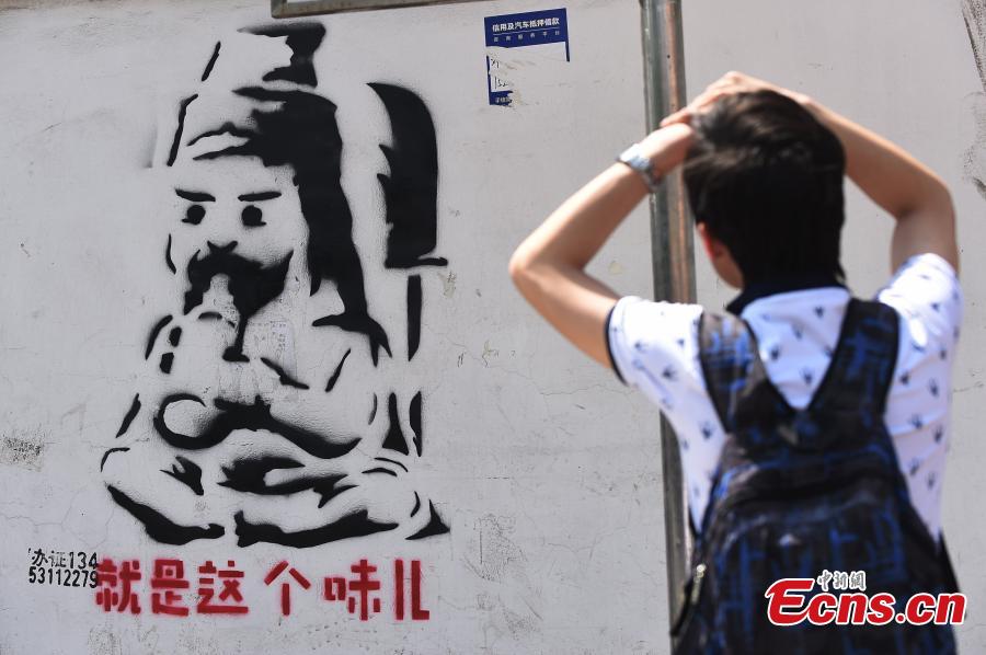 Graffiti artwork featuring Guan Yu, a well-known Chinese historical figure, on a wall in Taiyuan, North China’s Shanxi province, April 29, 2015. The artist, You Yang, 26, said he wants to spread Chinese culture, such as historical figures, in new ways to appeal to the younger generation. Guan Yu was a prominent general in the Three Kingdoms Period (220-280), but later he was deified and is still worshipped by many Chinese people today. (Photo: China News Service/Wu Junjie)