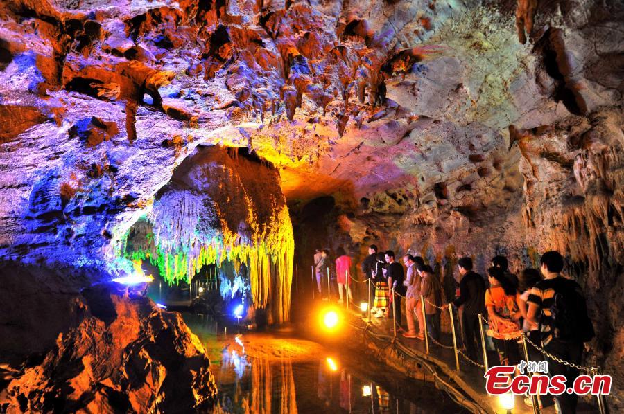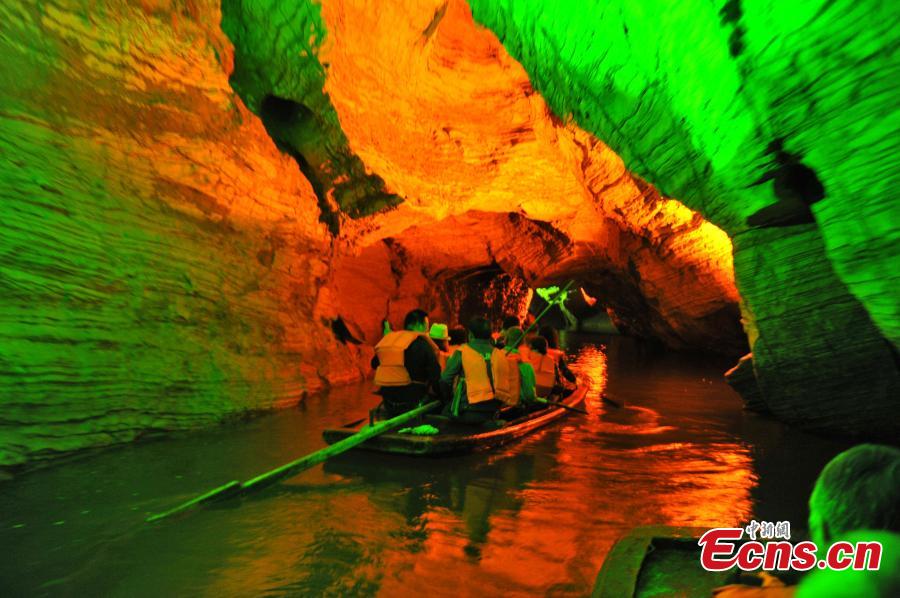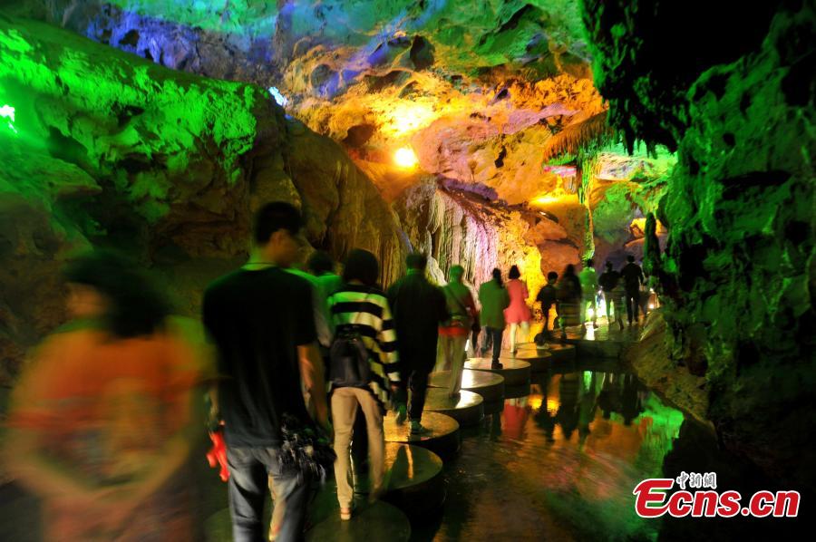 Tourists visit underground karst caves at a scenic spot in southwest China's Chongqing municipality, May 4, 2015. The underground caves and rivers attracted many tourists during the 3-day May Day holiday. (Photo: China News Service/Zhong Xin)