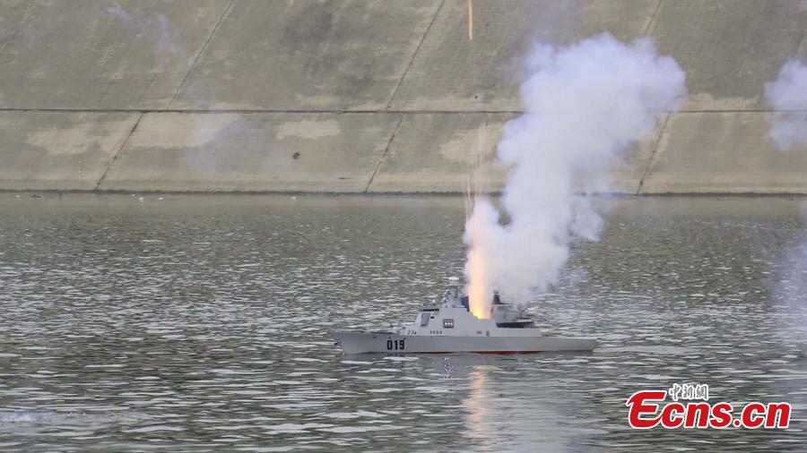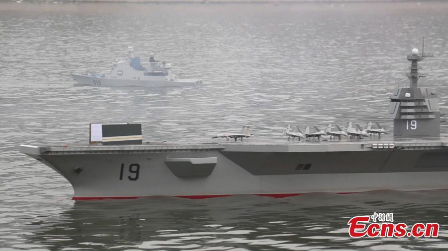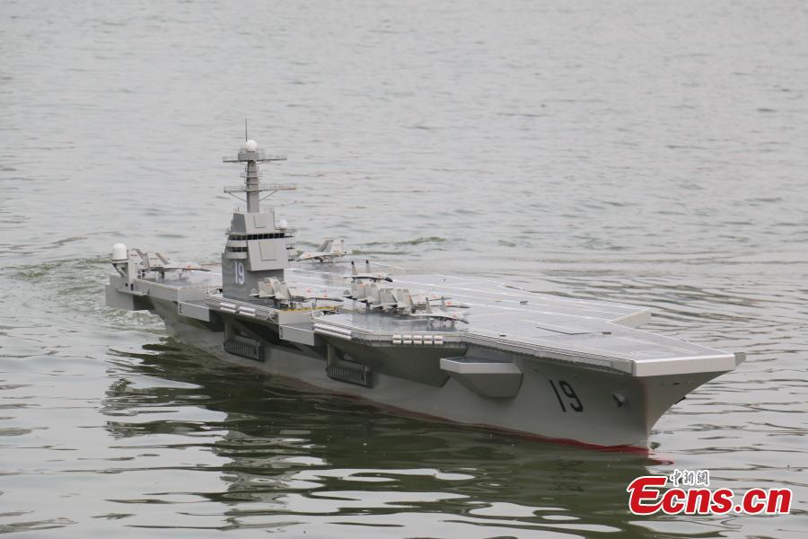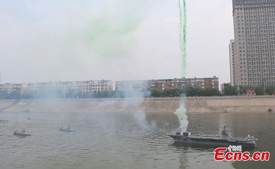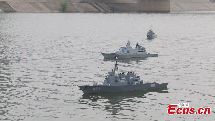 A model aircraft carrier, leading a fleet of four model destroyers, participates in a sea battle simulation on the Shaying River in Zhoukou, Central China’s Henan province, May 6, 2015. The Henan model is six meters long, 1.5 meters wide and 0.7 meters high. Powered by two motors, it has a full displacement of 800 kilograms and can travel at speeds of up to 25 kilometers per hour and for 90 minutes on a charge. On the model’s deck are 20 model fighter planes and vehicles while the cabin is installed with artillery, including rocket launchers. The model aircraft, which weighs 500 kilograms, cost more than 100,000 yuan($16,000). (Photo: China News Service/Yang Zhenghua)