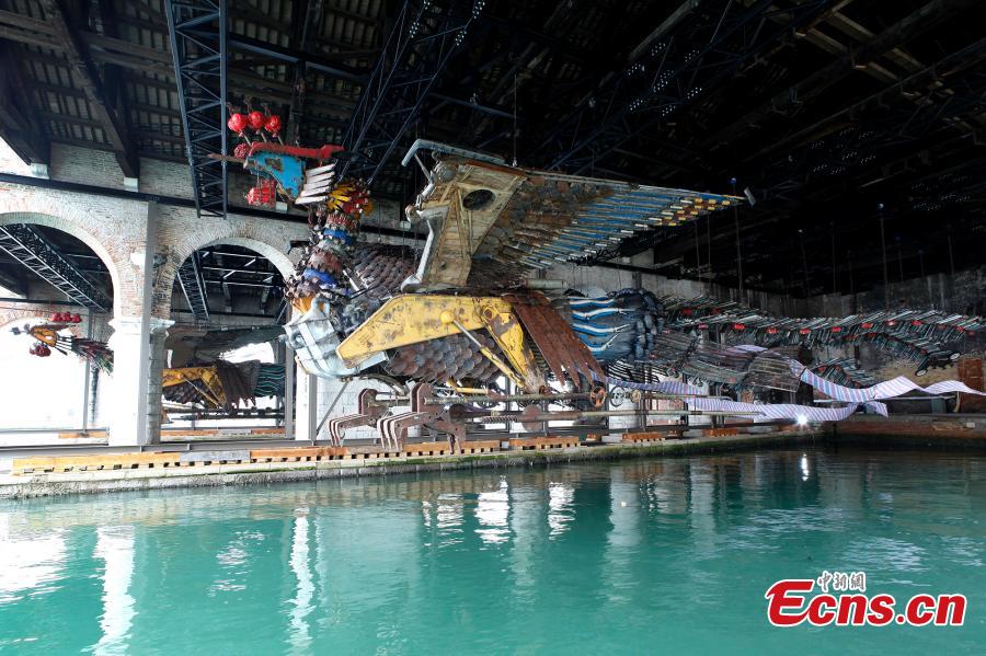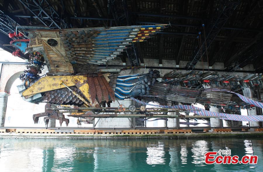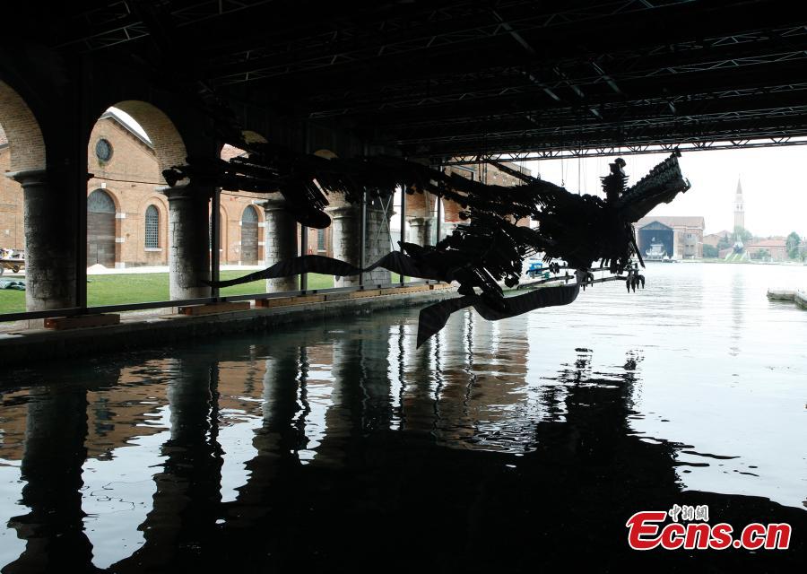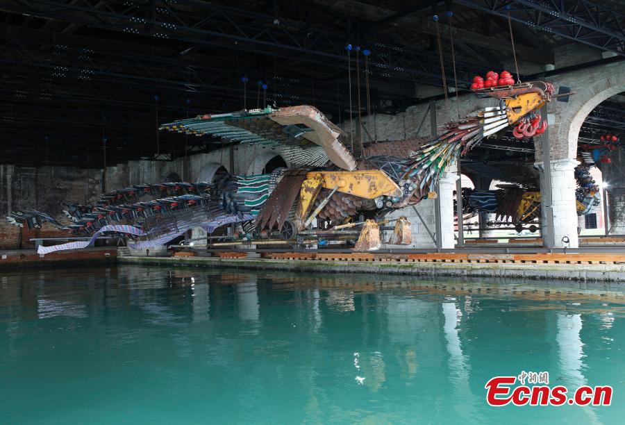A sculpture by Chinese artist Xu Bing, Phoenix, hangs above water between two boathouses at the Pavilion at Arsenale – Giardino delle Vergini in Venice for the 2015 Venice Biennale. The installation features two monumental birds fabricated from materials scavenged from construction sites in urban China, including demolition debris, steel beams, tools, and remnants of the daily lives of migrant laborers. Each sculpture is 13 meters long and weighs 8 tonnes. They were exhibited at the Massachusetts Museum of Contemporary Art in 2012, having been completed in Beijing in 2010. (Photo: China News Service/Zhong Xin)