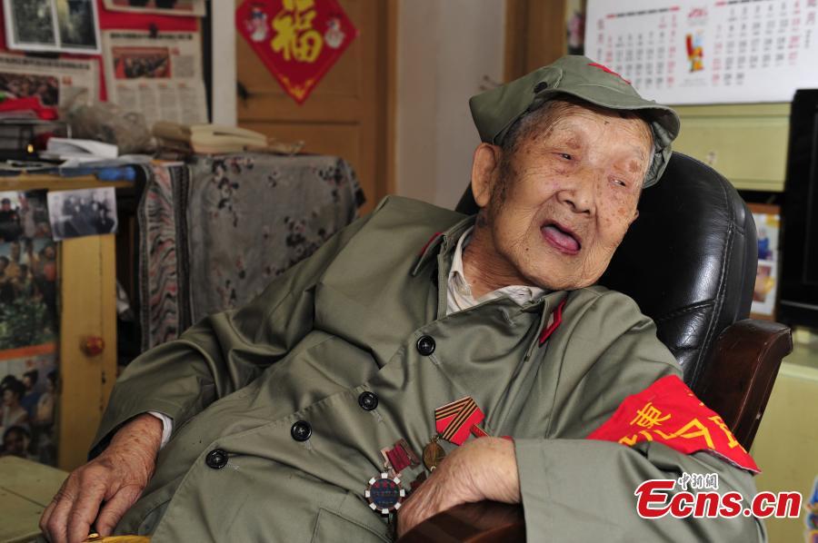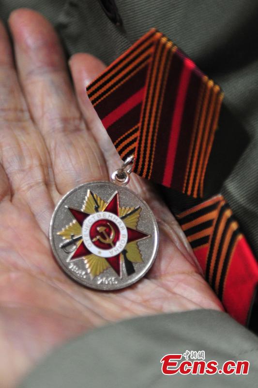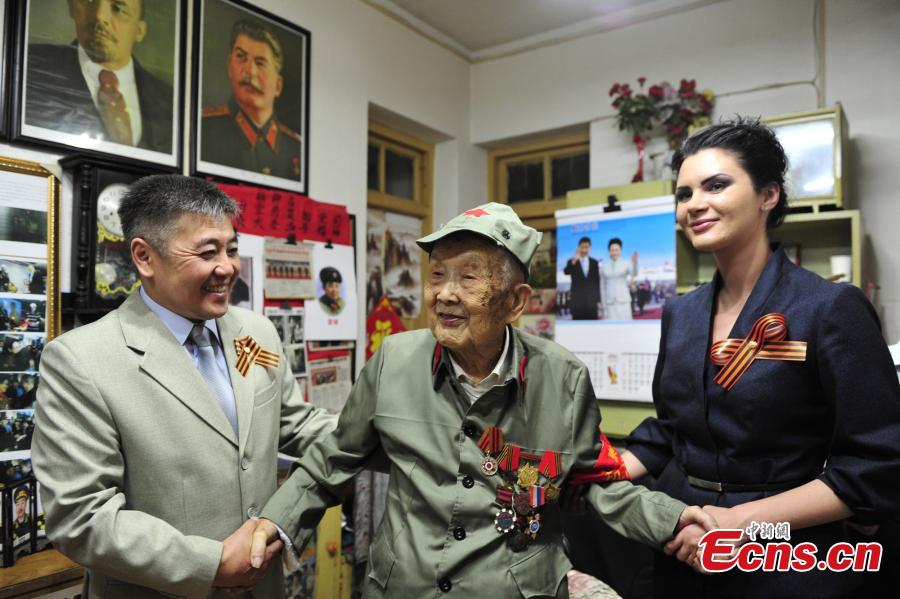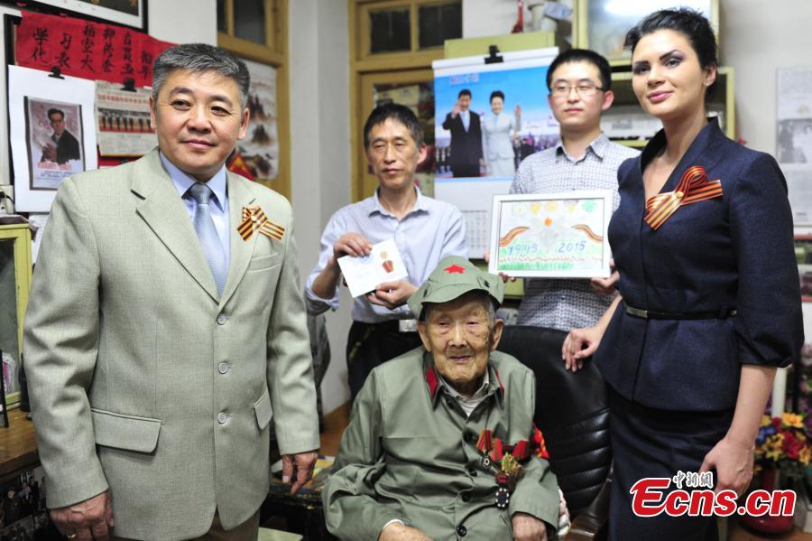 Damdinov Bazar, the First Secretary of the Russian Embassy in China, and his assistant present a medal marking the 70th anniversary of victory in the Great Patriotic War (1941-1945) to Lu Baoping in Yichang, Central China's Hubei province, May 7, 2015. Lu, 97, served in the USSR for three years during World War II. (Photo: China News Service/Wang Kangming)