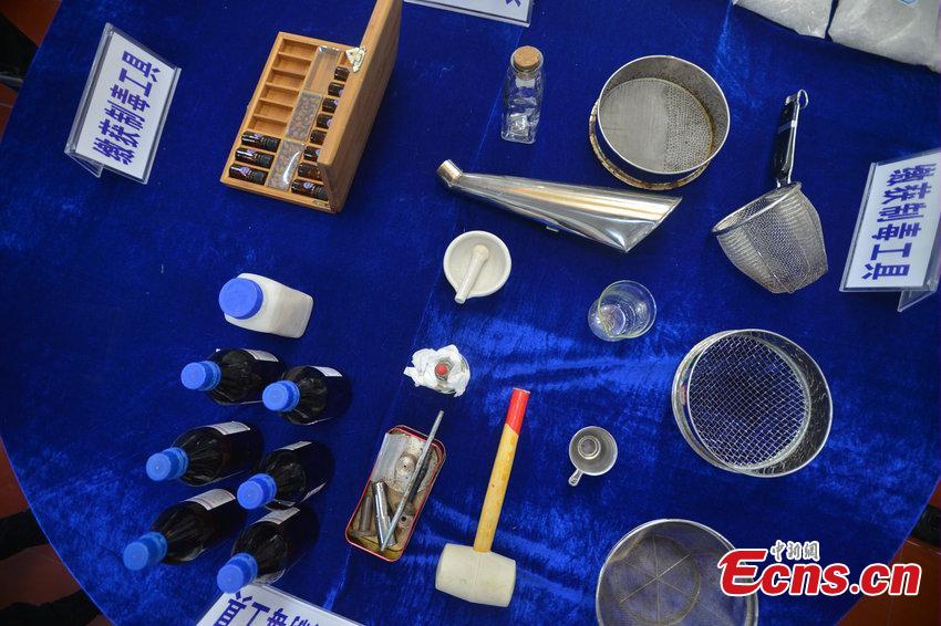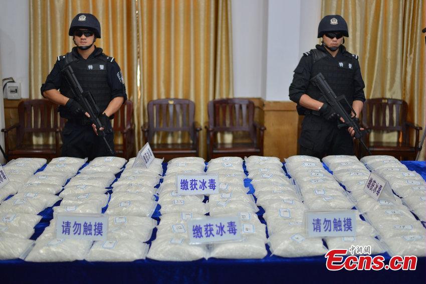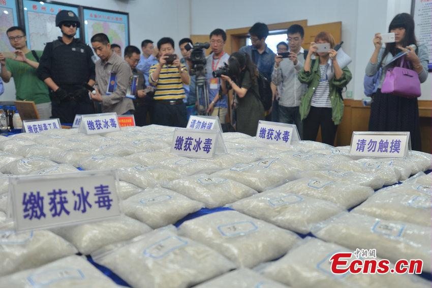 Methamphetamines, chemical agents and tools used to test drugs on display at a police station in Chenzhou city, Central China Hunan province, May 7, 2015. Local police cracked a drug trafficking gang and detained 10 suspects. They also confiscated 104.7 kg of methamphetamines, 271.3 gram of "magu", a stimulant composed of methamphetamine and caffeine, and 86,700 yuan (13,960 U.S. dollars) in cash. (Photo/CFP)