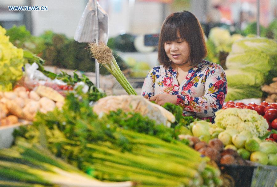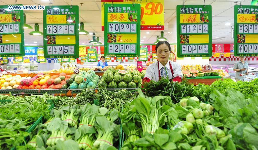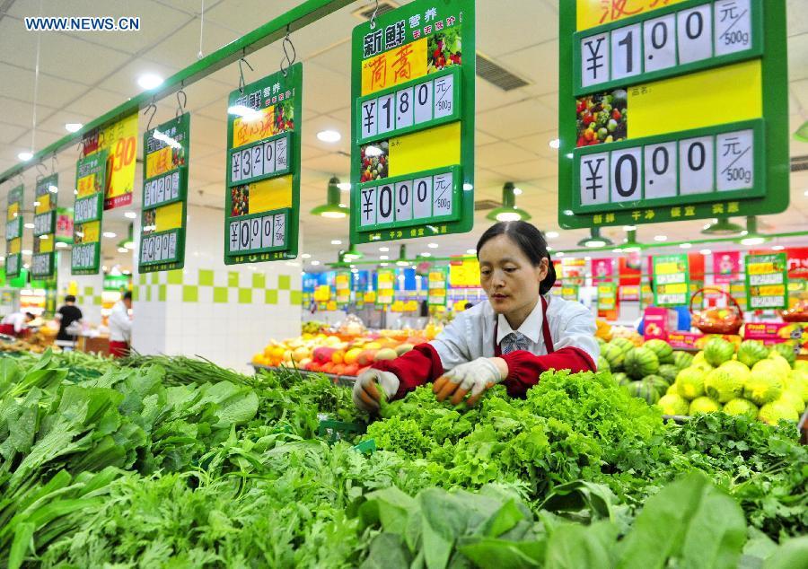 A seller arranges vegetables at a supermarket in Cangzhou City, north China's Hebei Province, May 8, 2015. China's consumer price index (CPI), a main gauge of inflation, grew 1.5 percent year on year in April, the National Bureau of Statistics said on May 9. (Xinhua/Mou Yu)