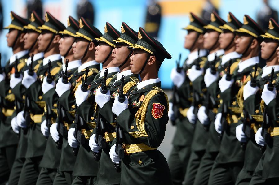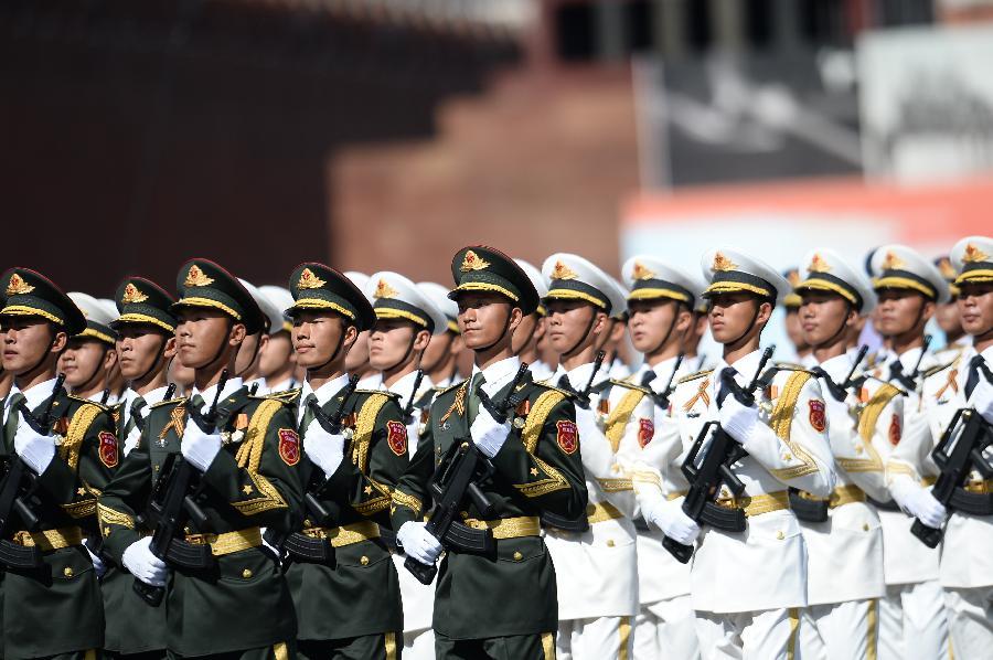 The guard of honor of the three services of the Chinese People's Liberation Army (PLA) take part in the military parade marking the 70th anniversary of the victory in the Great Patriotic War, in Moscow, Russia, May 9, 2015. (Xinhua/Jia Yuchen)